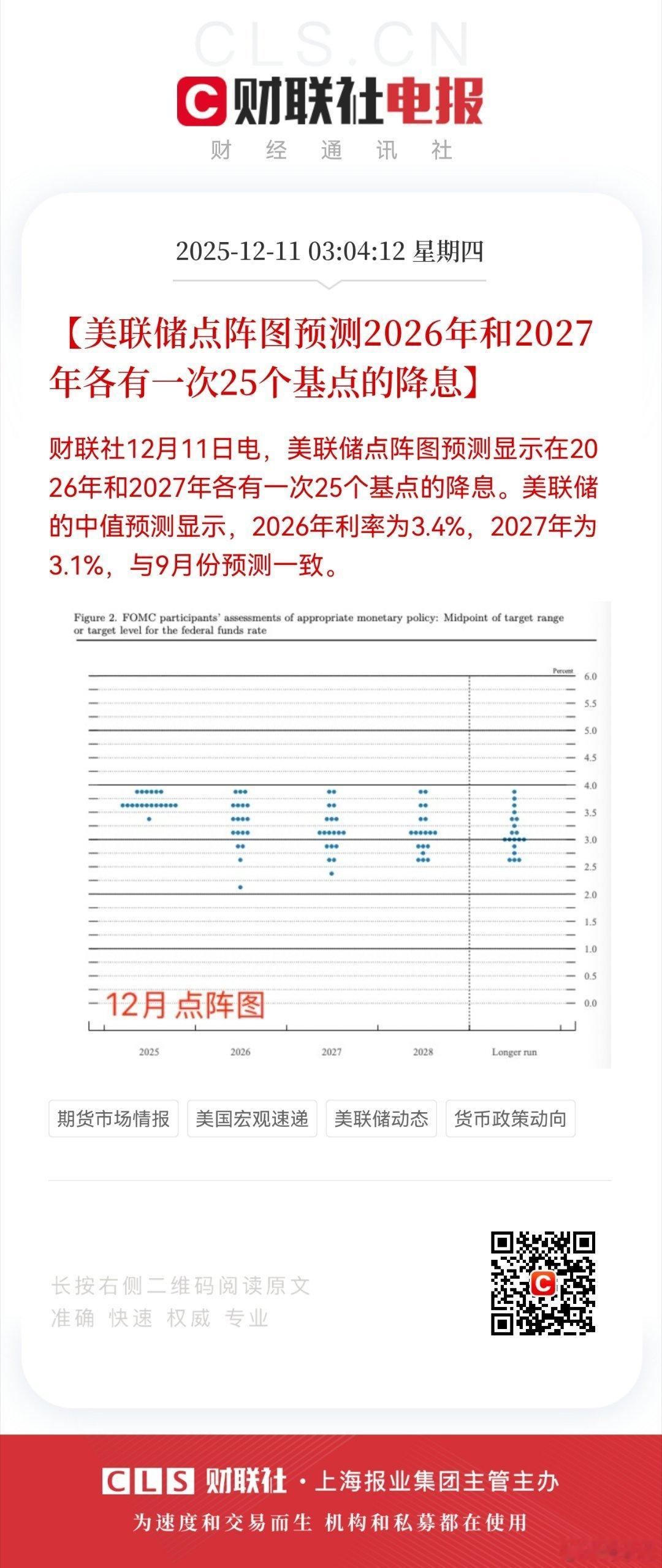【美联储点阵图预测2026年和2027年各有一次25个基点的降息】财联社12月11日电,美联储点阵图预测显示在2026年和2027年各有一次25个基点的降息。美联储的中值预测显示,2026年利率为3.4%,2027年为3.1%,与9月份预测一致。
