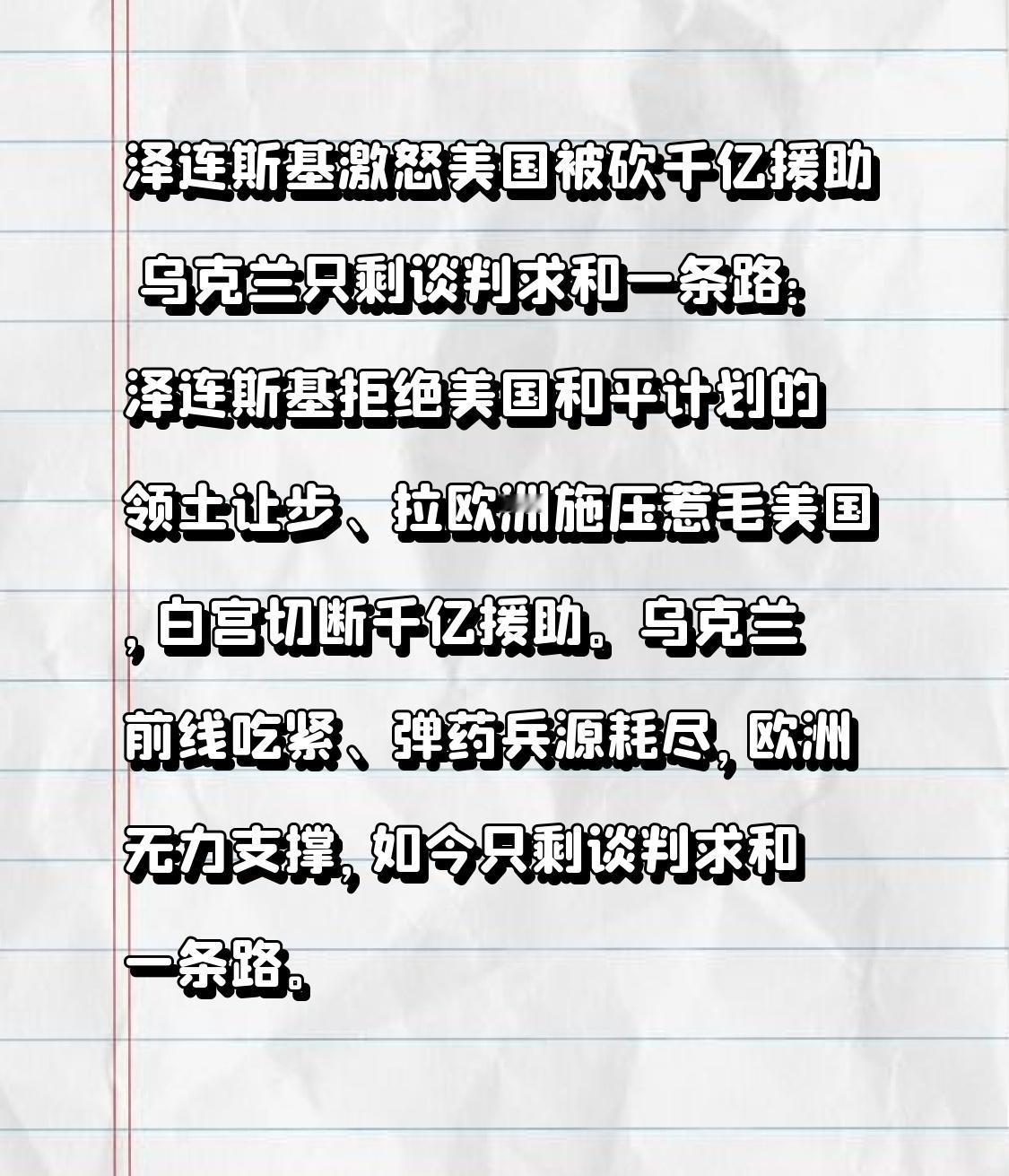泽连斯基激怒美国被砍千亿援助 乌克兰只剩谈判求和一条路:泽连斯基拒绝美国和平计划的领土让步、拉欧洲施压惹毛美国,白宫切断千亿援助。乌克兰前线吃紧、弹药兵源耗尽,欧洲无力支撑,如今只剩谈判求和一条路。
