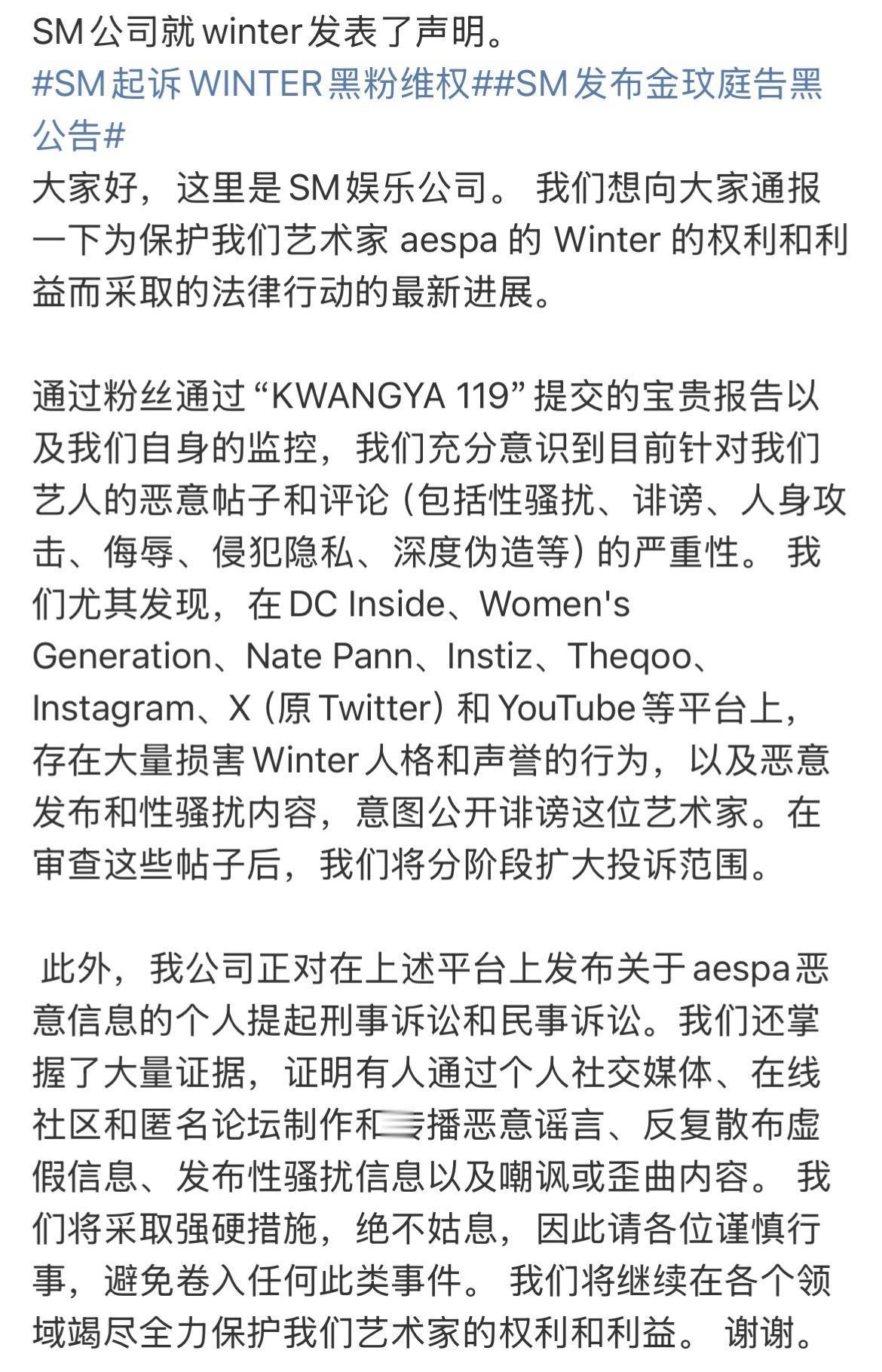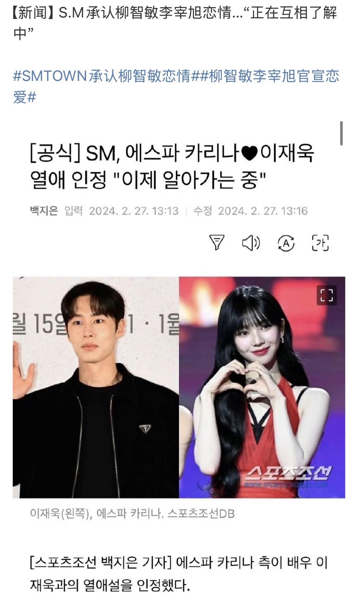 公司回应aespa的两次“恋情”【告黑or承认】你更pick谁?时隔多日S.M.Entertainment终于对aespa成员金玟庭的恋情争议做出回应“进行告黑”,而早前aespa队长柳智敏与演员李宰旭传出恋情时,S.M.Entertainment却选择直接承认恋情,这应该就是真谈和无辜的区别吧!(p4附上柳智敏为恋爱手写的道歉信)