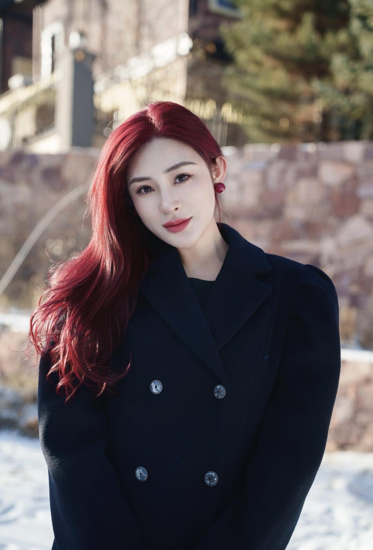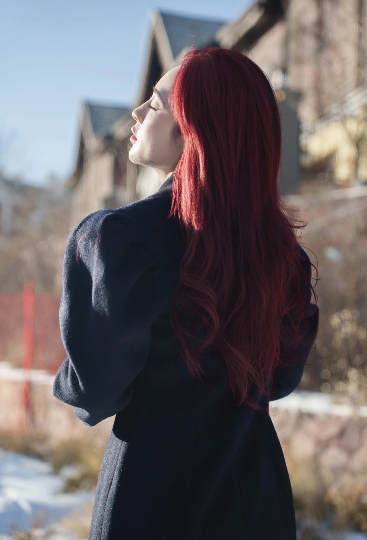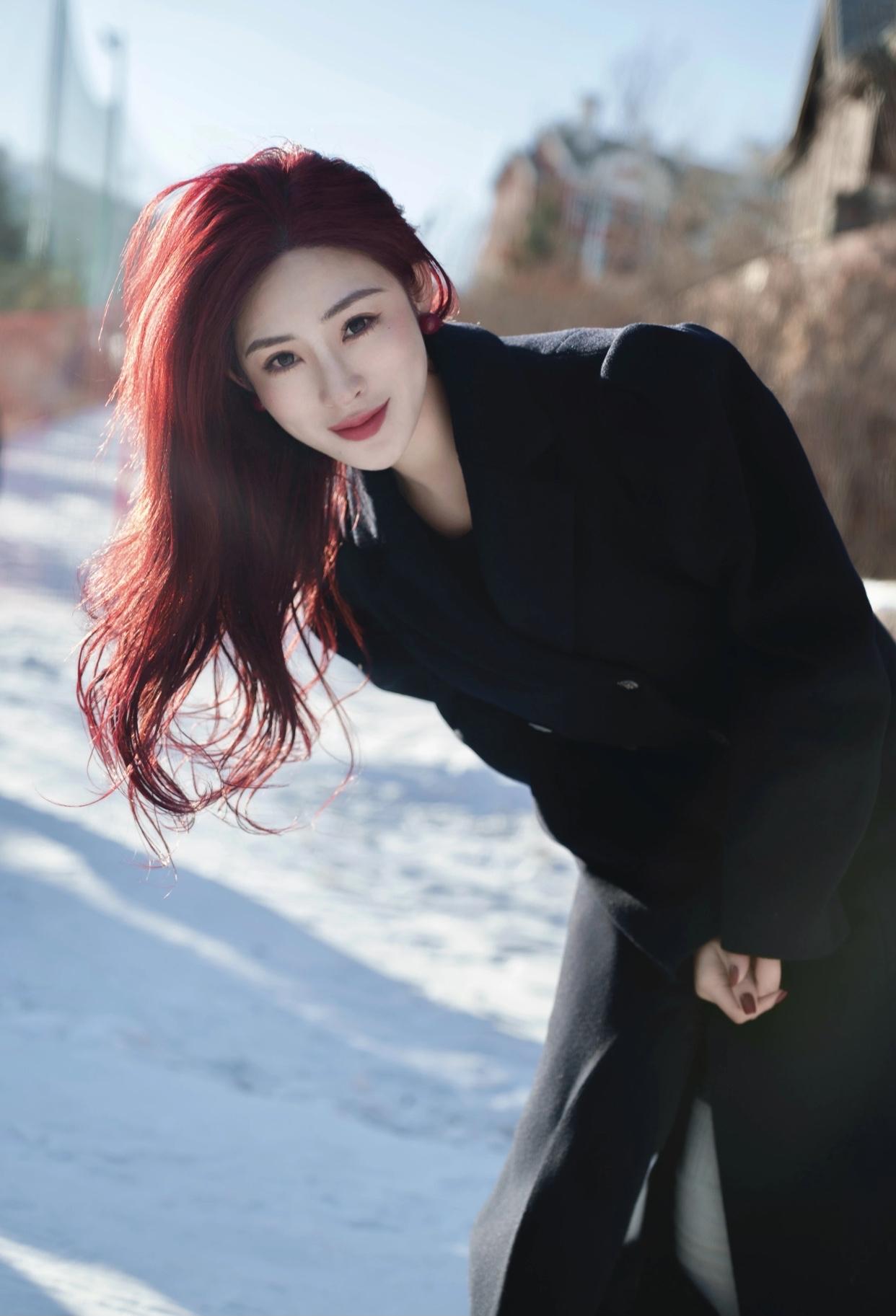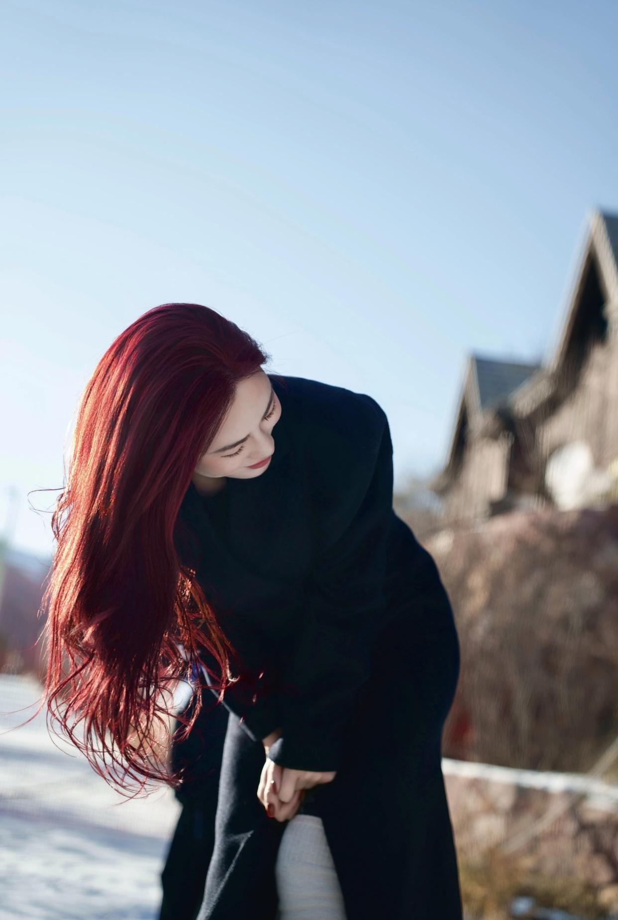 冬日暖阳下,红发少女与黑衣相映成趣,静谧而美好。黑衣少女自拍 梦幻红发少女