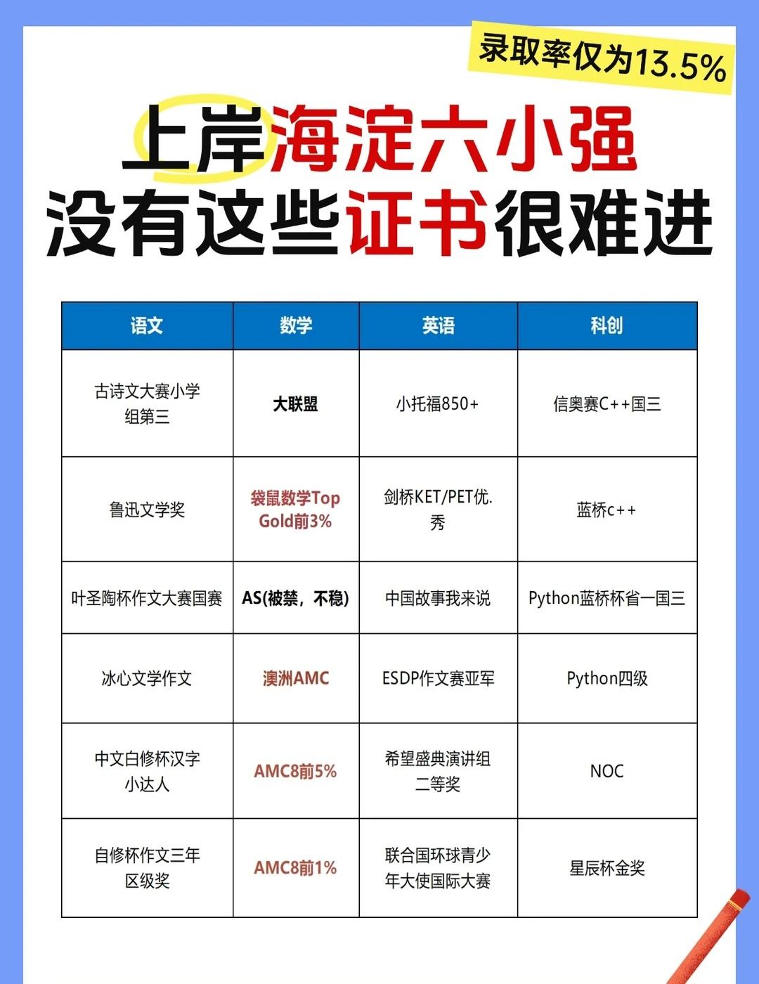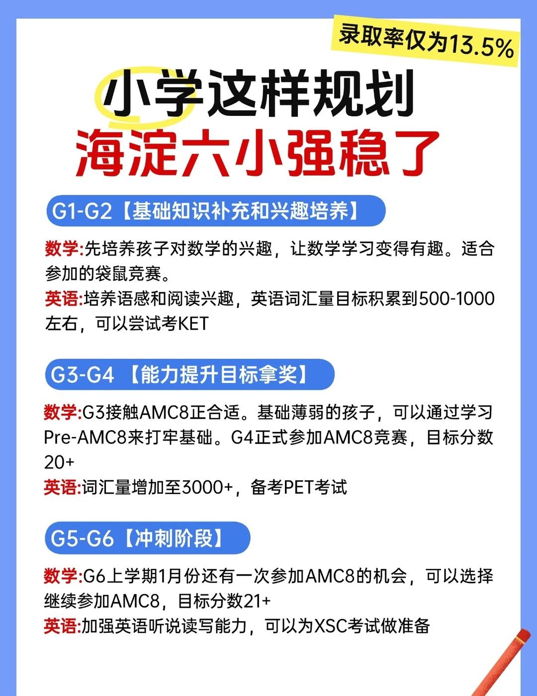 上岸海淀六小强,没有这些证书很难进! 🌈海淀妈妈圈流传着一句话:没AMC8和KET证书,六小强简历筛都过不了!“四年级前拿下KET,五年级冲刺AMC8全球5%” 已成为冲击海淀六小强的隐形门槛。 🌈数据显示,六小强录取学生中,持有AMC8奖项的比例达65%,KET/PET更是高达92%。 🌈从能够入读“海淀六小强”的学生简历来看,建议家长要把精力放到这三点上:语文、数学、英语齐头并进。 ✅【数学】 相对来数学的重视程度比较高,像北大附中以及101中学都比较偏爱竞赛娃,目前国内杯赛被禁赛,可考虑AMC8、澳洲AMC、美国数学大联盟等竞赛,对小升初择校有一定助力。 ✅【英语】 英语除提高校内成绩外,也可考虑参加剑桥英语考试,考过PET相对来说竞争力会比较大。 ✅【语文】 语文可考虑参加一些白名单赛事比如叶圣陶杯、冰心文学等 竞赛 国际数学竞赛 国际竞赛 北京六小强 AMC8竞赛 AMC8数学竞赛 北京海淀六小强 amc8课程