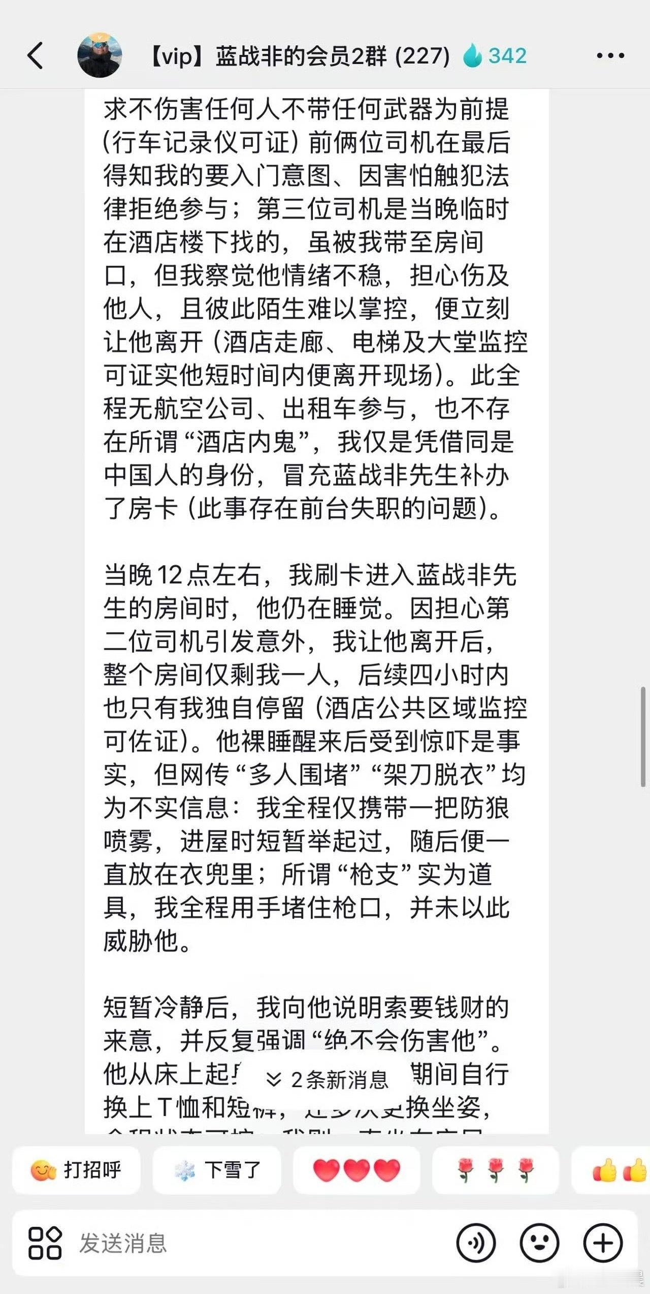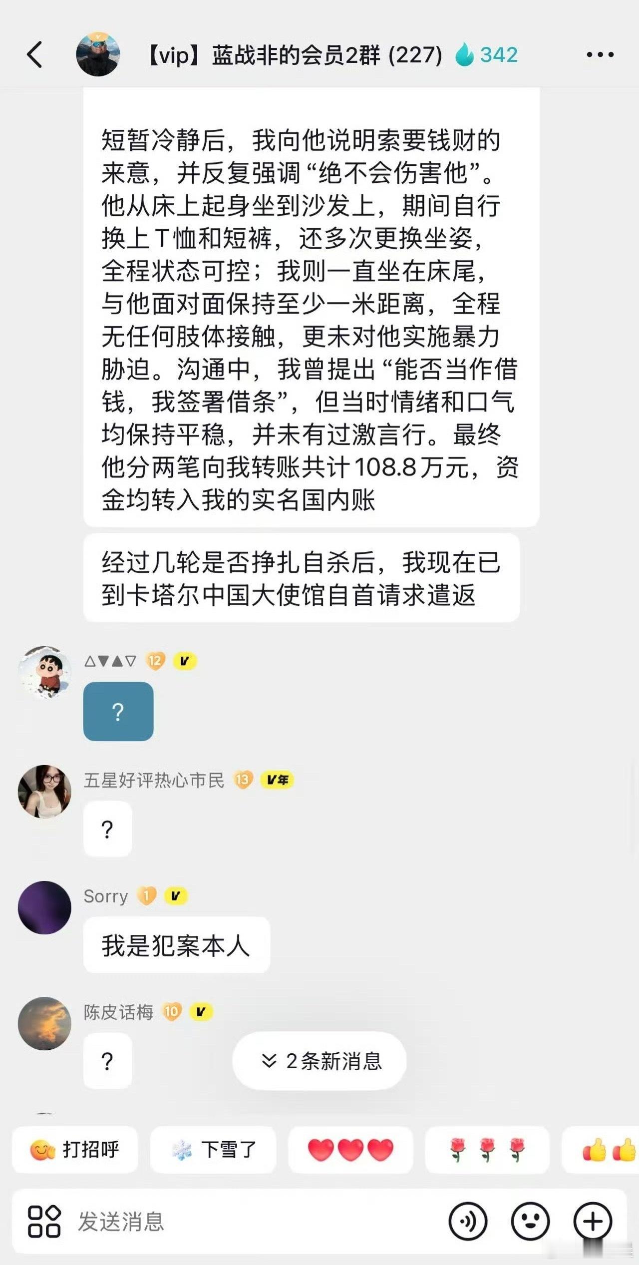 蓝战非绑架案的走向怎么越来越奇怪了? 前脚说案子在南非可能破不了,后脚就有疑似绑匪在蓝战非粉丝群“自首”…… 这位说因炒股和消费欠下巨额债务,债务快到最后期限,走投无路一下一时冲动,萌生向蓝战非索要钱财的念头,又说黑哥是找的司机,过程中没带武器,只有一把道具枪,房卡是冒充蓝战非办的,目前已到卡塔尔大使馆自首请求遣返。 这一切感觉合理有不合理的,听这个人的描述好像事实并没有蓝战非说的那样恐怖,但毕竟蓝战非是当事人,他描述的也是自己的感受。 受害者对细节夸大化,施暴者对细节避重就轻,这个其实已经非常符合角色逻辑了,这个人大概率是看事情闹大了,所以赶紧出来自首,模糊绑架行为,变成入室抢劫甚至更轻之类的罪责,毕竟绑架罪好像是10年起步,入室抢劫情节不严重外加自首情节,罪责也会减轻。 不过入室抢劫+持枪抢劫(玩具枪也会认定真枪)+金额巨大,以上三个条件都是抢劫罪的加重情节,满足其中任意一个都是十年起步,这个事情又闹这么大,估计在15年左右。