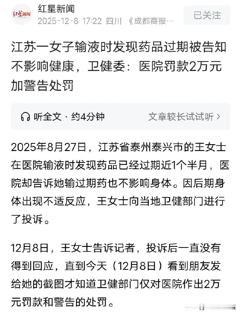 江苏泰州,女子肺炎去输液,意外发现注射液已过期45天,女子告知护士后,护士赶紧处理掉输液袋,之后院方表示,输了过期药水,对身体没有任何影响,没想到,次日女子就出现了发热、胸闷等症状,可院方却以女子心理压力大、饮食不佳等理由推托,提都不提药水过期的事。女子气不过,投诉到卫健委,结局让她始料不及。 去医院看病,多数人都是把胳膊一伸,心里认定医生不会出错,可王女士这次的就诊经历,让她彻底意识到:医院也可能“掉链子”,而且掉得离谱。 事情发生在8月27日,王女士咳嗽反反复复,想着去医院检查一下,结果查出肺炎,医生建议输液一周,治疗方案很普通,可就这一瓶挂在她头顶的药水,却出了天大的问题。 她坐着输液闲得无聊,抬眼扫了一下药袋上的字,有效期写得清清楚楚,可这一算,她心里咯噔一下——那瓶药居然过期一个多月了,她愣了几秒,确认自己没算错后立马叫来了护士。 可护士的反应让人更加心凉,她既没有表现惊讶,也没安慰几句,而是飞快地拔掉针头,然后把那瓶还剩一点的药拎走,速度快得像是怕被拍照一样。 等王女士反应过来想留个视频,人家已经把药丢进医疗垃圾桶里找不着了,后面医院的态度更让人生气。 本以为他们会紧张,结果却装得轻松得很,说什么“过期一点没事,不会对身体造成影响”。 王女士半信半疑地回家,不料第二天就开始心慌、胸闷、发热,一个本来是治肺炎的病人,反倒被折腾得更难受。 可当她再去找院方说理,对方不仅不承认过错,还一本正经地说她这是“压力太大”“吃东西没吃好”,把问题全往她身上推,就差没说她自我感觉太丰富。 王女士无奈,只能向卫健委投诉,她本以为要等个结果,结果却是几个月后让朋友转发的截图告诉她:这事早查完了,她却是最后一个被通知的。 12月3日,泰州相关平台公布了处理结果——官方确认医院那天确实给患者用了过期药,属于违法行为。 卫健委也处罚了:警告一次,罚款2万元,按法规,罚款从1万到10万不等,2万算不上轻,也不算重,但对医院来说无非是交个罚款了事。 最讽刺的是,事情都定性了,医院却从头到尾没找王女士说一句道歉,被问起原因,负责人居然说因为王女士投诉到了卫健委,他们“不知道怎么处理”,就一直拖着。 这态度比过期药还令人心寒,根据法律,只要医院给患者用了过期药,这本身就是药品缺陷,不用王女士证明什么复杂因果。 更别提当时护士那一套“急忙处理现场”的动作,本身就给人一种掩盖事实的感觉,这种情况下证据丢失的责任也应该由医院承担。 现在官方通报摆在那儿,成了王女士的底气,既然违法已经被确认,她完全可以拿着这份认定书,要求医院赔偿自己的医疗损失、误工、精神损害等,而不是让医院交个罚款就算“翻篇”。 这件事也提醒大家:以后输液别光低头玩手机,有空扫一眼药袋,很多人以为医院不可能犯这么低级的错误。 但现实是,一旦出问题,有的医院第一反应不是及时解决,而是先把证据处理掉,再告诉你是“心理作用”,在医院本该最安心的地方,反倒还得靠自己留个心眼。
