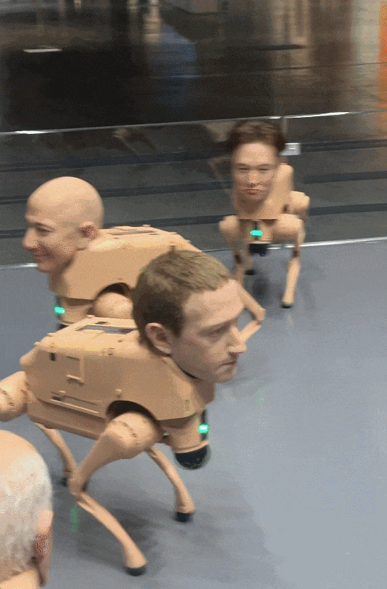 马斯克人头机器狗,70万一只被抢空!网友:太诡异了,十个道士才能镇住![嘘] 在今年的迈阿密巴塞尔艺术展上,数字艺术家Beeple带来了一件新作品,名叫《Regular Animals》。 它由七只戴着名人面具的机器狗组成,面具形象有埃隆·马斯克、马克·扎克伯格这些科技名人,也有安迪·沃霍尔、毕加索这样的艺术大师,甚至还包括Beeple自己,每只定价十万美元,目前已经全部售出。 这些机器狗不只是静态雕塑,它们内置的摄像头会不停地观察周围的观众,然后把拍摄到的画面通过内部的人工智能进行处理,最终生成一张风格独特的艺术印刷品,从机器狗身体下方的一个出口被打印出来,这个过程被设计得有点像生物的自然行为,颇有些玩味。 有意思的是,每只狗“创作”出的画风,都和它戴的面具人物紧密相关,比如,戴着扎克伯格面具的机器狗,产出的图像带有虚拟空间和数字化的感觉,马斯克版本的作品则往往是黑白色调,线条硬朗,充满未来科技感。 看到Beeple的“名人机器狗”新闻,评论区简直比艺术展还热闹! “这才是真正的艺术!把科技巨头‘变成’到处溜达、还能‘拉’艺术的狗,这讽刺效果拉满了。” “最绝的是贝佐斯那款被设定为‘只看不拉’, 讽刺有些大佬哪怕不输出观点,其存在本身就有巨大影响力,这个细节太犀利了。” “看着这些机器狗用马斯克的脸盯着我,还不停拍照,后背发凉! 这不就是我们生活的写照吗?每天被各种APP算法推荐‘投喂’信息,我们到底还有没有自己的选择?” “作品名《Regular Animals》(普通动物)点题了——在科技巨头眼里,我们是不是就像被驯化的动物,乖乖消费着他们定制的内容?” “70万一只?还秒空?贫穷限制了我的想象力, 看来有钱人的世界,不仅快乐我想象不到,连艺术品的画风我也理解不了。” “如果能定制成扫地机器人,边干活边‘吐’钞票,我或许会考虑一下。” “不经本人同意,把世界首富们的脸安在机器狗身上,这不算侵权吗?” “在美国,这种具有明确社会批判属性的艺术创作,侵权的门槛很高,Beeple也声明目标是对事不对人。” “Beeple之前那个NFT就卖了近7000万美元, 他的作品本身就有巨大的金融属性,这次结合实体雕塑和NFT,再次引爆市场,说明数字艺术收藏已成气候。” 你觉得在日常生活中,哪些体验最让你感觉自己像被“算法投喂”的“Regular Animal”? 欢迎在评论区分享你的真实想法,一起加入这场关于未来、科技与艺术的脑洞大讨论! 信息来源:市场资讯