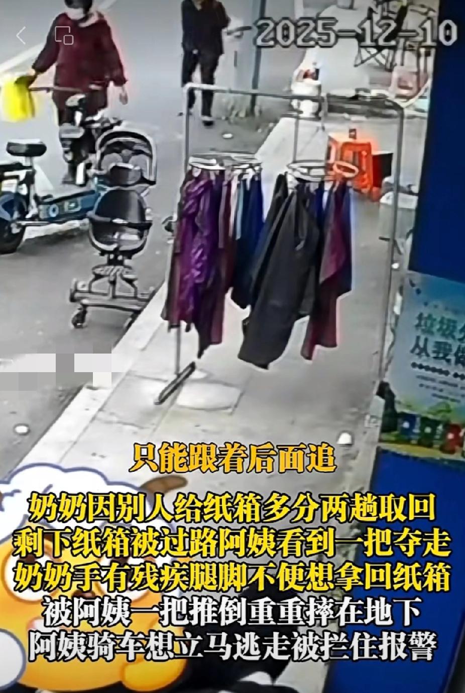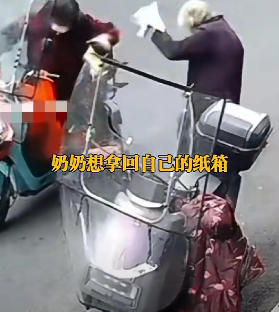 这下事大了!12月10日,浙江一奶奶因别人送的纸箱太多分两次拿回,被过路阿姨一把夺走并推倒! 监控视频显示:一位好心的老板将店内不要的纸箱送给了老奶奶,老奶奶一次拿不完,于是分两次拿。第二趟来取纸箱时,奶奶刚把纸箱拿到手里,一骑着电车的大妈看到了。她将电瓶车停下,快步走向老奶奶,一把夺过了奶奶手里的纸箱。 奶奶焦急万分,想要回自己的纸箱,却因为腿脚不便难以追赶。而大妈故意控制自己的速度,一步三回头的看着腿脚不便的奶奶着急忙慌的追赶。真的是太过分了! 但在大妈坐上电瓶车的间隙,奶奶努力挪动着双腿赶上,抓住了自己的纸箱,却被大妈一下推翻,重重地摔倒在地,难以起身! 奶奶年纪大了,这一下摔得可不轻,路过的人和周围店铺的老板都看不下去了,连忙指责大妈的不是。 大妈见状准备骑电瓶车逃走,被路过的女子拦住,众人帮忙报了警! 没想到几个废旧纸箱竟能惹出这么大的事!先不说这纸箱是有人送给奶奶的,大妈没有权利抢。就算是别人扔在路边不要的纸箱,也是奶奶先拿在手里的,就应该是奶奶的。 而大妈好手好脚,几个纸箱不过是块八毛钱,值得做这么丢人的事情吗? 希望奶奶平安无事,万一摔出个好歹,必须让大妈全权负责! 从法律的层面来讲,抢夺老人纸箱本身就构成抢夺罪,是违法的。此事件中老人几个纸箱虽然不值多少钱,但老人一旦摔伤,大妈必须给予老人相应的赔偿!对此,你怎么看呢?