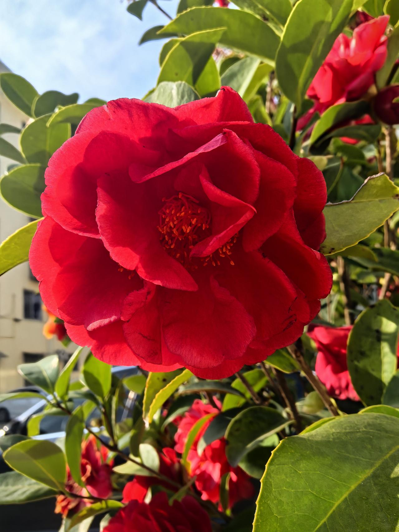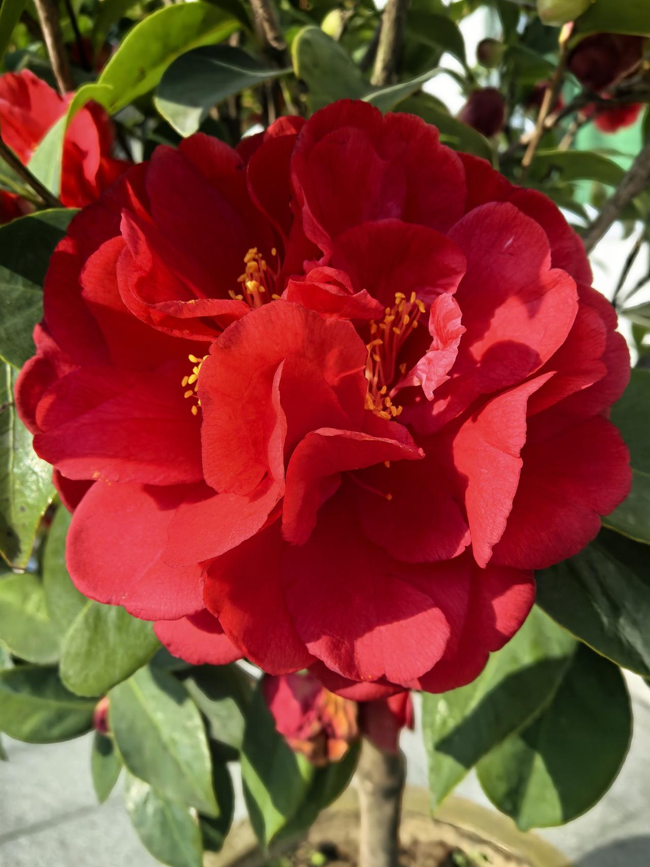 门口的一大盆茶花,养的真好!可以用繁花似锦来形容,大朵大朵的红色花娇艳欲滴,给这