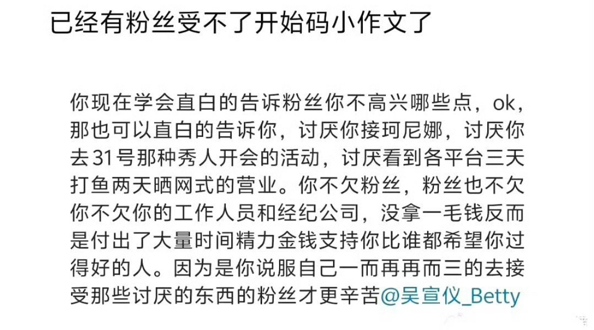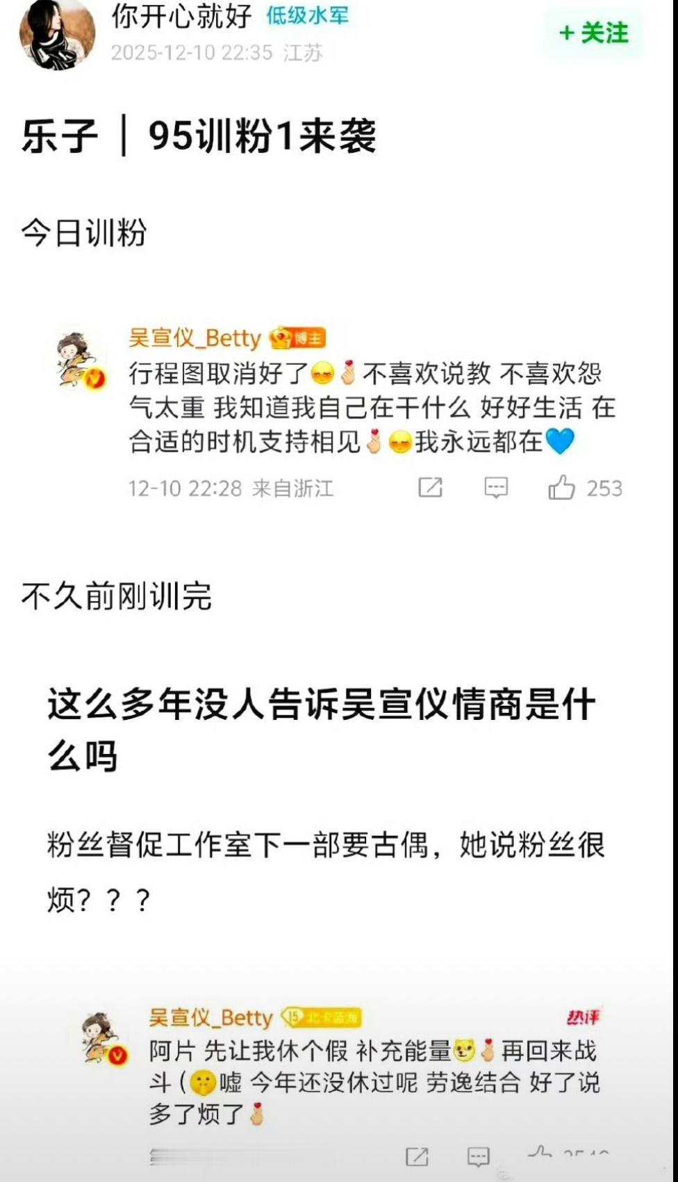 吴宣仪训粉以后,有粉丝表示脱粉了。她为什么脾气这么大。。。。这是小牌大耍吗?鞠婧祎白鹿赵露思虞书欣杨超越跟她差不多大,哪一个不比她火,但是没有一个像她这样的。