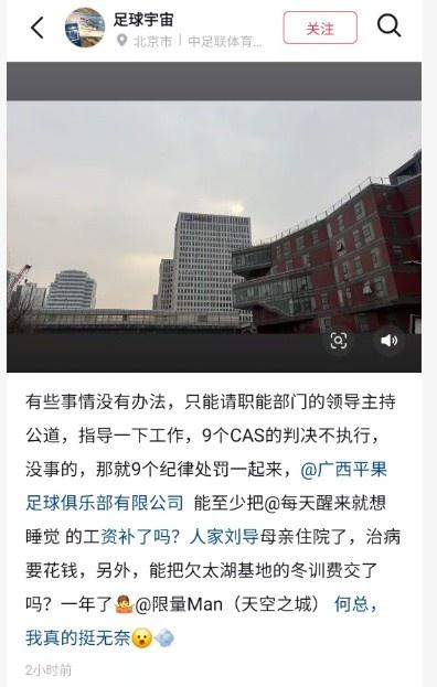 苗原在个人微博分享一张广西平果被讨薪的图片,同时配文:今天看到广西平果又被讨薪了,今年他们的准入确实很困难,潜在资方入主之前,俱乐部的债务和欠薪就已经有八位数,现在市里的态度比较明确,全力确保俱乐部准入工作的推进,但努力最终是否有成效,就要看天意了。