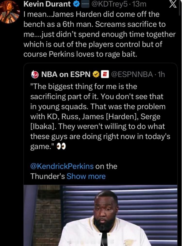 帕金斯在节目中表示,目前这支雷霆的牺牲精神让他印象深刻 这是当年杜兰特哈登和威少不愿做的事对此,杜兰特转推评论道:“我的意思是,詹姆斯·哈登作为第六人替补出场,这对我来说就是一种牺牲。只是我们在一起的时间不够长,这不是球员能够控制的,但帕金斯显然喜欢用这种话题来挑起争论。”随后,杜兰特删除了该评论。杜兰特休斯顿火箭新赛季篮不住