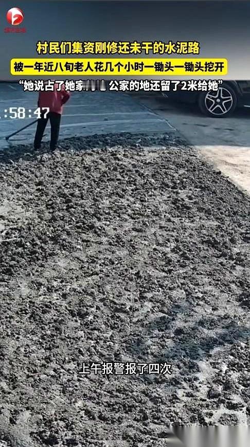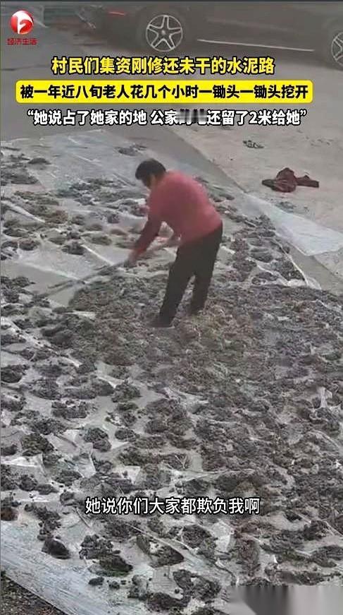刷到这个新闻,我真的一口气没上来。 一锄头,一锄头,把几十户人家凑钱刚铺好的水泥路,给刨了。 干这事儿的,是个八十岁的老太太。 就因为她觉得,这路占了她家的地。 可笑吗? 地,根本不是她的。 人家村民修路的时候,还好心给她家门口多留了两米宽的道儿。 但她不管。 我不管事实,我只管我“觉得”。 警察来了,她停手。警察一走,她继续刨。 这哪是锄头啊,这简直是把无赖耍到了极致。 说真的,这事儿最让人寒心的,不是那点水泥钱。 是她这一锄头下去,刨掉的是人心。 是大家伙儿好不容易凑起来的,那点想把日子过好、把路走顺的心气儿。 每个集体里,好像总有这么一两个人。 大家辛辛苦苦往前划船,他非得在船底凿个洞。 他享受着所有人努力换来的平稳,却又觉得别人的付出理所应当,自己的利益寸土不让。 这种人,才是最可怕的“成本”。 他毁掉的,不是一条路。 而是下一次,再有人想站出来牵头做事时,心里的那份犹豫和胆怯。 建一座桥,需要一百个人。 但毁了它,只需要一个人,和一颗自私的心。