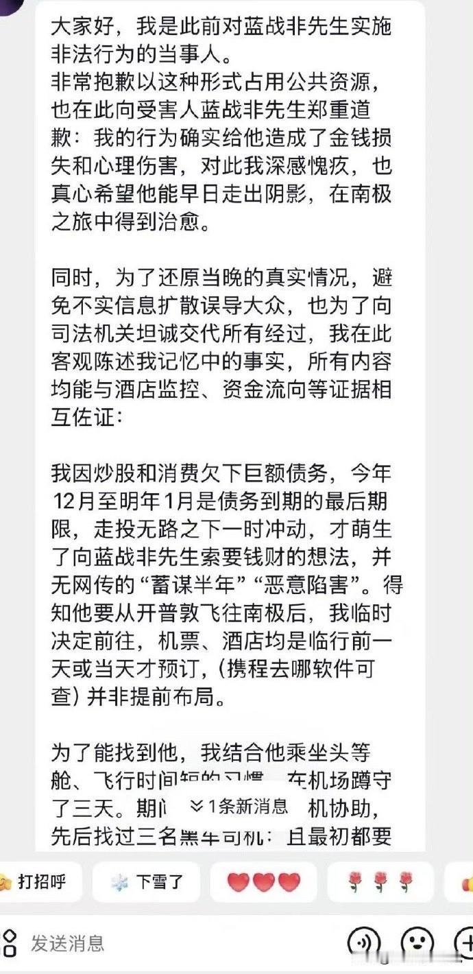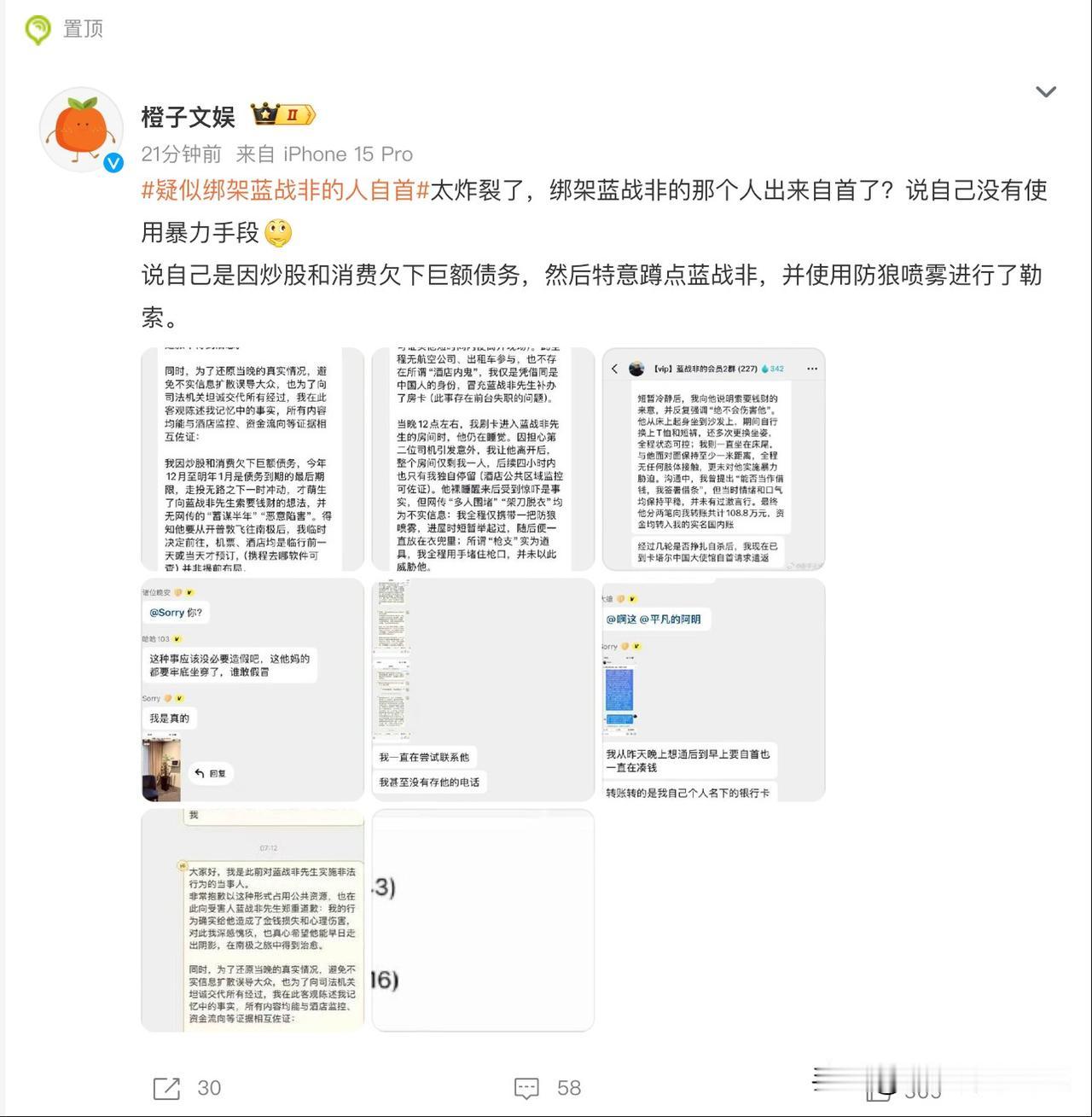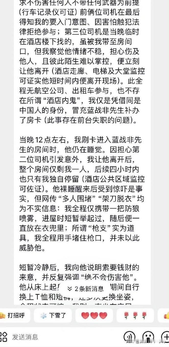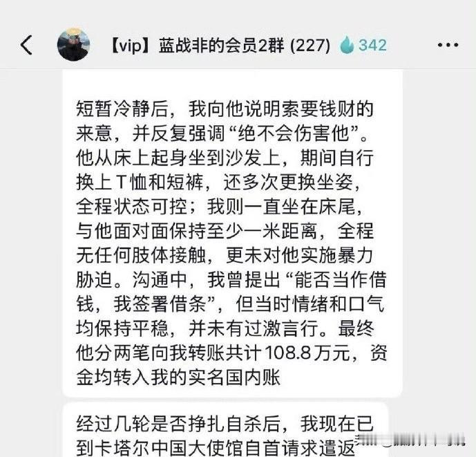 疑似绑架蓝战非的绑匪投案自首了,该消息迅速登顶热搜,当我点开看完后才知道,除了基本事实相符外,很多细节都对不上。嫌犯说并没有蓄谋半年和买通酒店,都是他自己临时起意而且实施绑架时就只有他一个人,并且是心平气和的说话。全程无肢体接触、无暴力胁迫,无言语过激,然后蓝战非就给他转款100多万,且全程只用了防狼喷雾就搞定了!如果这是真的,那绑架这种事情也太轻松了吧,感觉就是去喝喝茶、聊聊天再摆出个防狼喷雾就搞定。所以,看了这条疑似的情况说明,我感觉我的三观受到了颠覆性的影响。我承认,有些时候世界是荒诞的,但荒诞成这个样子我还是第一次见到。反正大家别当真,就当段子看,一切以最终官方官宣为准!蓝战非旅游记录