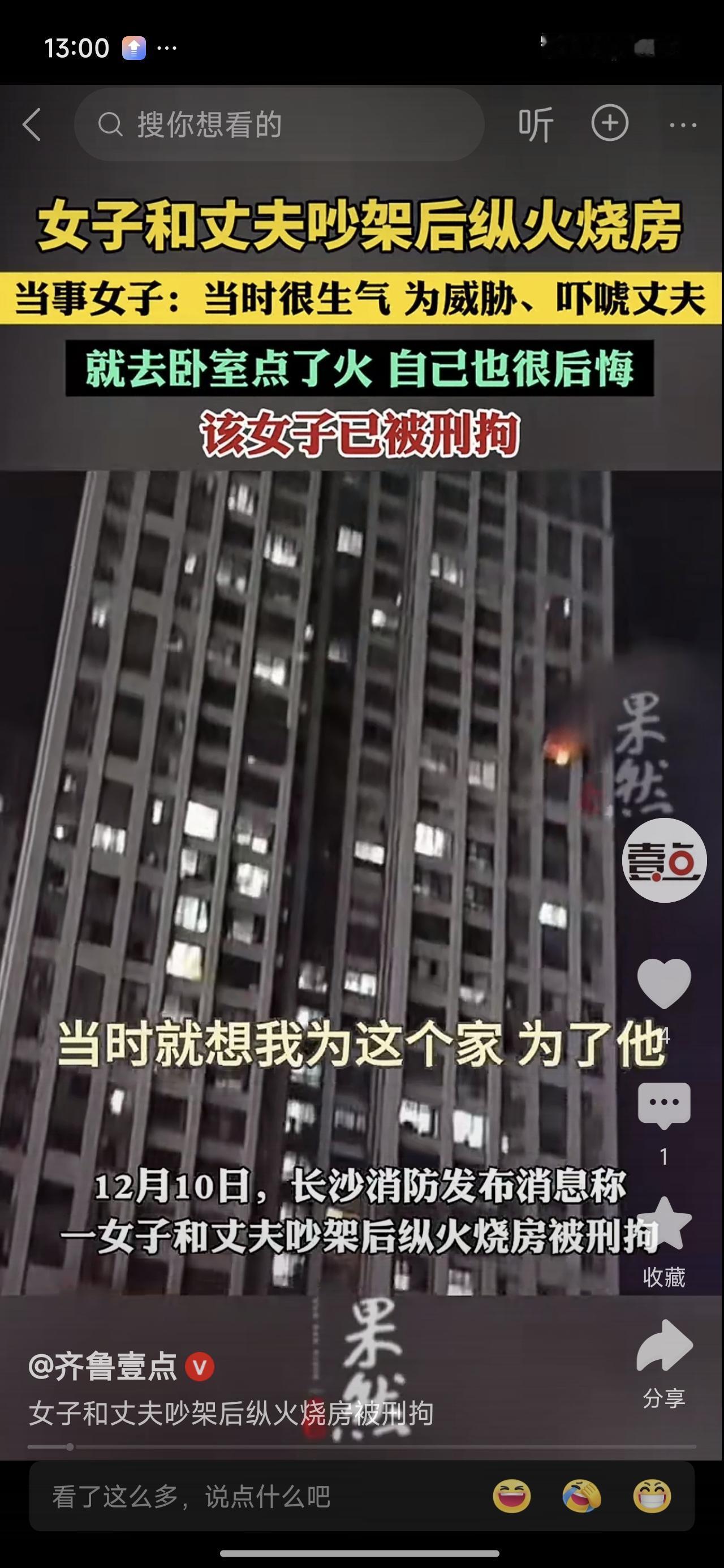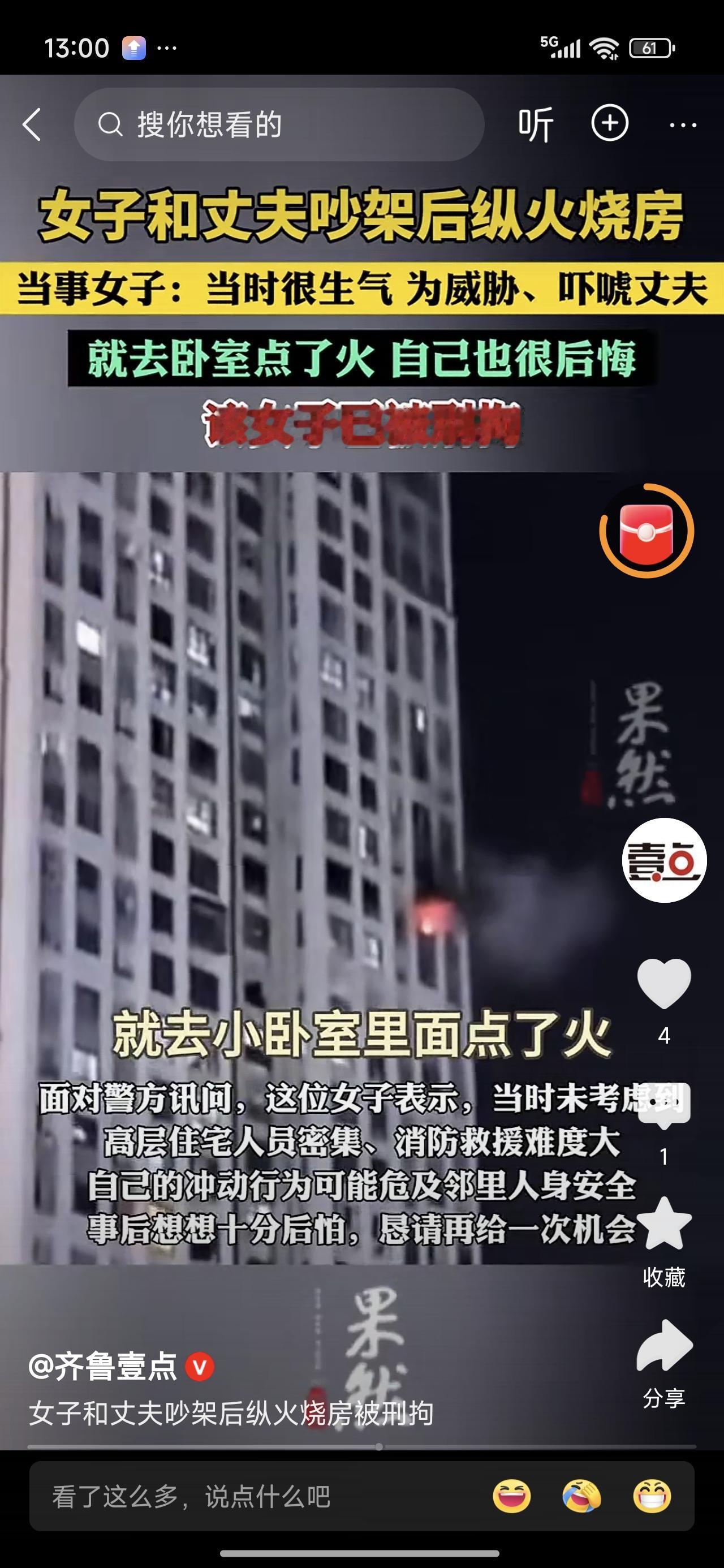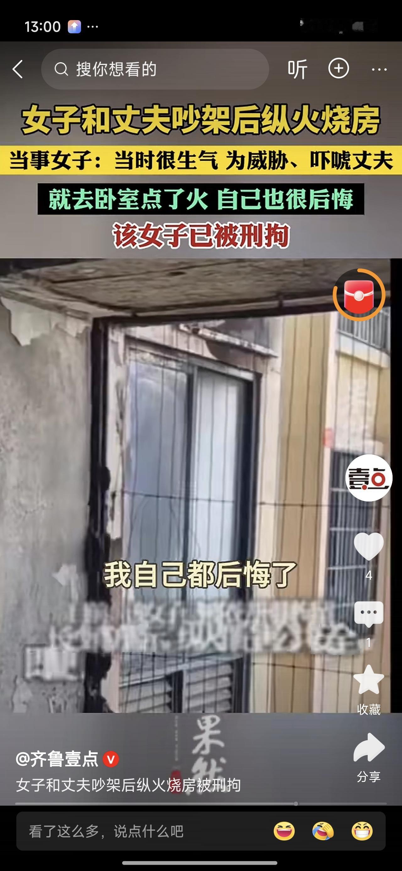 这是什么脑子啊?觉得自己为这个家,付出那么多,跟老公吵架去小卧室里面点了一把火,救不了的时候就后悔了! 就这脑子还知道后悔啊!救不了的时候才后悔,看来真是个大傻叉啊! 就这样的,自由以后让她有多远滚多远!这样的怕后面是个隐患啊!