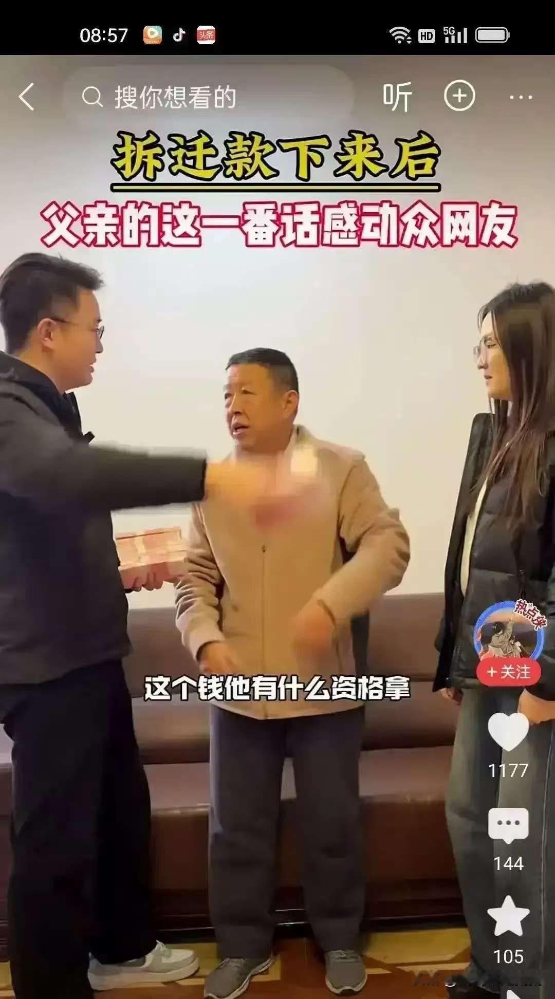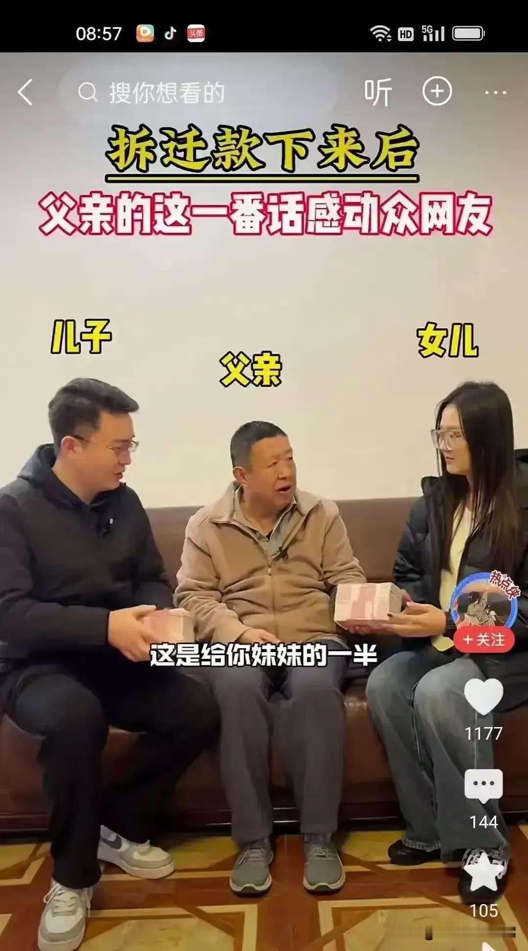 老父亲把几百万拆迁款摆桌上,当面给儿女一人一半。 儿子突然把钱全搂到自己怀里,老人拍桌吼他,他才把钱推回去。 视频里女儿一句话没说,只低头坐着。 近日这段视频在网上引发热议,相关话题迅速冲上热搜。知情人透露,老人的老房子拆迁获补480万,这笔钱是他大半辈子的积蓄,原本早就和儿女约定好一人一半。老人拍桌时怒吼“我还没死呢”,语气里满是失望,现场气氛十分僵硬。 儿子三十多岁,看着体面却做出抢钱举动。有网友爆料,他平时总抱怨老人偏心妹妹,声称自己要养家压力大,妹妹嫁得好不缺这笔钱。但拆迁款是老人的财产,怎么分配该由老人做主,就算想多要,也该好好商量,直接搂走的行为既不合情也不合理,更是不顾亲情。 女儿全程低头沉默,手指攥着衣角。有网友觉得她懦弱,也有人猜测她早习惯了哥哥的做法,知道争辩没用。现实中不少家庭都有类似问题,总觉得儿子该多占,可父母的偏心和子女的自私,只会让亲情越来越淡。 金钱就是一面镜子,照出人心真实模样。老人辛苦一辈子,想让儿女过得好,没想到拆迁款成了亲情的试金石。亲情不该被金钱算计,再有钱,没了亲情也只剩空虚。 各位读者你们怎么看?欢迎在评论区讨论。