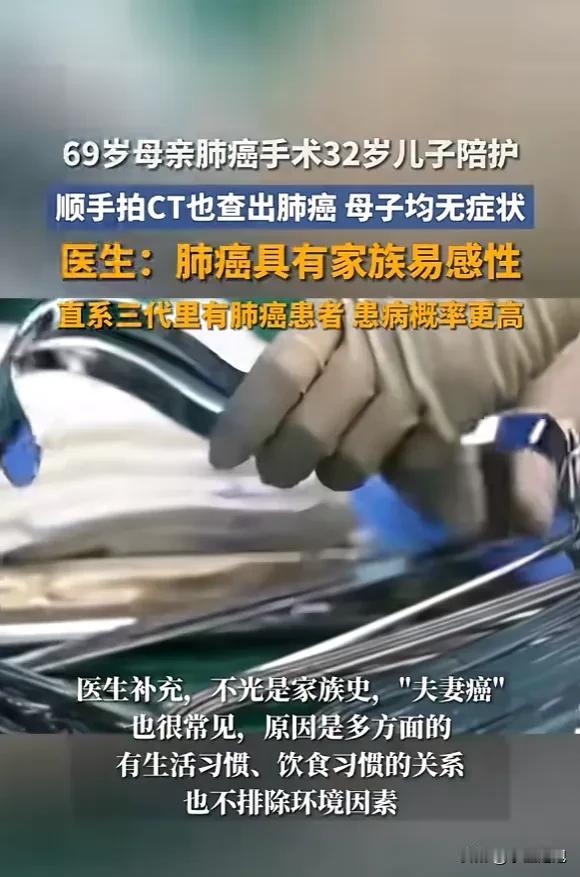 “太可怕了!”浙江宁波,一老人去体检,没想到竟查出肺癌,住院治疗后,32岁的儿子天天在医院陪护,顺便也做了个体检,发现竟然和母亲一样患了肺癌,令人疑惑的是,母子二人之前均没有不适症状,医生的解释令人意外! 这是12月7日齐鲁晚报报道的真实事件,当事人是宁波的陈阿姨和她32岁的儿子小李。陈阿姨是跟着社区组织的免费体检查出的肺癌,肿瘤处于早期,未扩散到淋巴结;小李因陪护期间护士建议做CT,同样查出早期肺癌,两人都没有咳嗽、胸痛等相关症状。 接诊医生在采访中明确说明,肺癌不直接遗传,但家族易感性明显——直系三代内有肺癌患者的人,患病概率比普通人高出一截。除了遗传相关的易感因素,长期共同生活形成的相同习惯,比如一起吃高盐食物、家人中有吸烟者,或是共同接触厨房油烟、装修污染等环境因素,都会提升“家族式患病”的可能,这类情况在临床中并不罕见。 目前当地社区已经针对该事件,在辖区内开展了肺癌筛查的相关科普,重点提醒有家族病史的居民定期做低剂量CT检查。不少网友在相关报道下留言,有人说“自己父亲有肺癌,一直没敢去查”,也有人提到“家里老人查出病后,全家都去做了相关体检”。 当前,我国肺癌的发病率在恶性肿瘤中位居前列,且约70%的患者确诊时已是中晚期。像陈阿姨和小李这样通过体检早期发现的案例,治疗效果和预后都远好于晚期患者,但很多人仍因“没症状”“怕花钱”等原因,忽视了相关筛查。 你觉得社区或单位应该强制要求有家族病史的人做相关体检吗?你身边有没有人因为忽视筛查,耽误了病情?