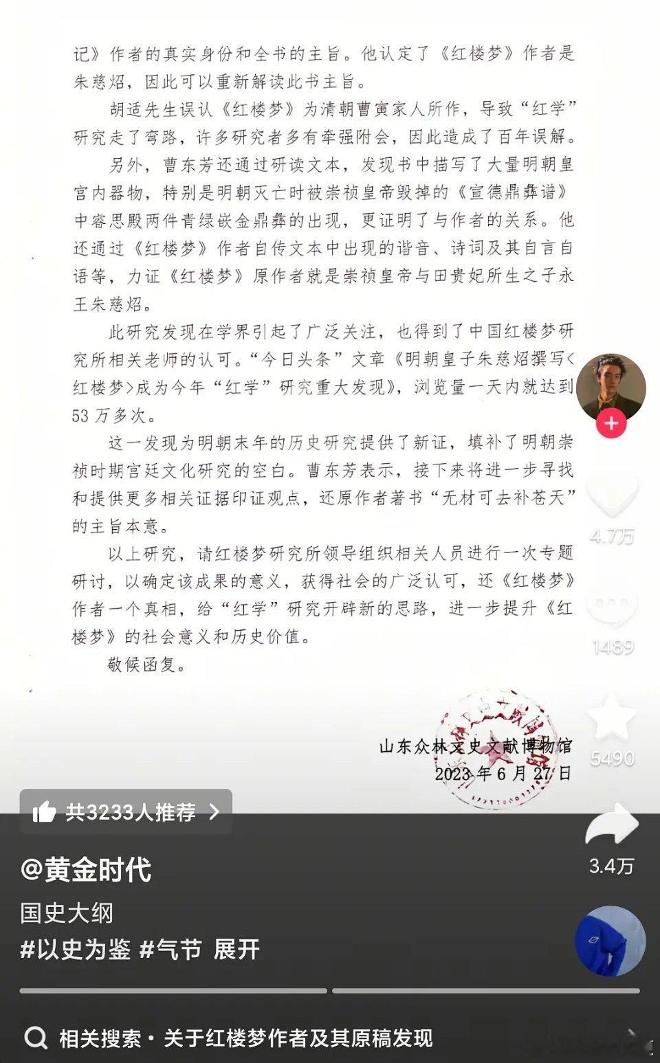 OMG 抖人已推翻红楼梦作者。这篇论证甚至还引用了今日头条浏览量50w+作为论据,证明引起了学界广泛关注😭