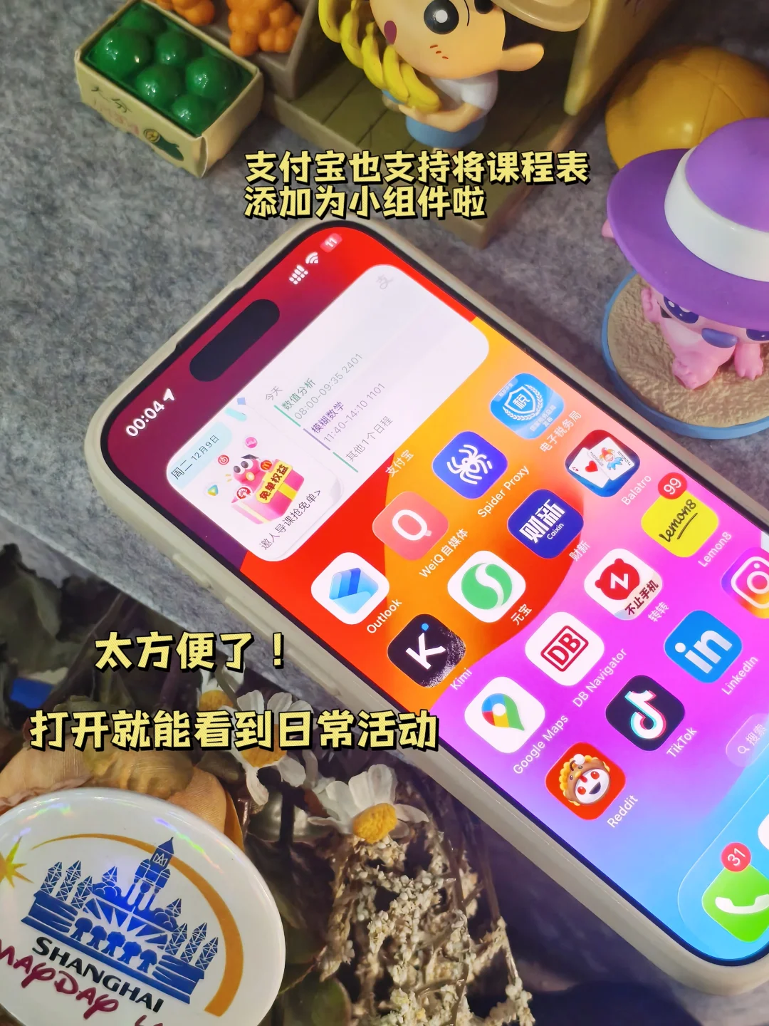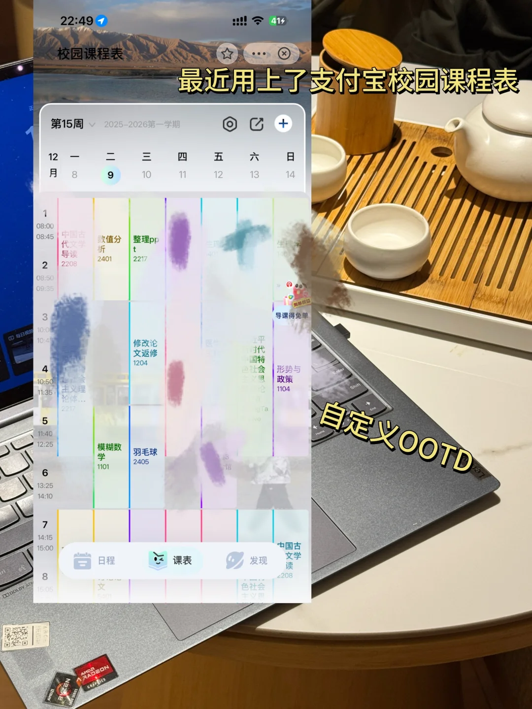 最近发现了支付宝校园课程表,一键就可以导入课表,还可以添加到桌面小组件,非常方便,最近越来越忙,也会把日程添加进去,节约大脑cpu很提升效率。而且它还可以换自定义皮肤,大脑看到喜欢图片的一瞬间还是蛮解压的。
