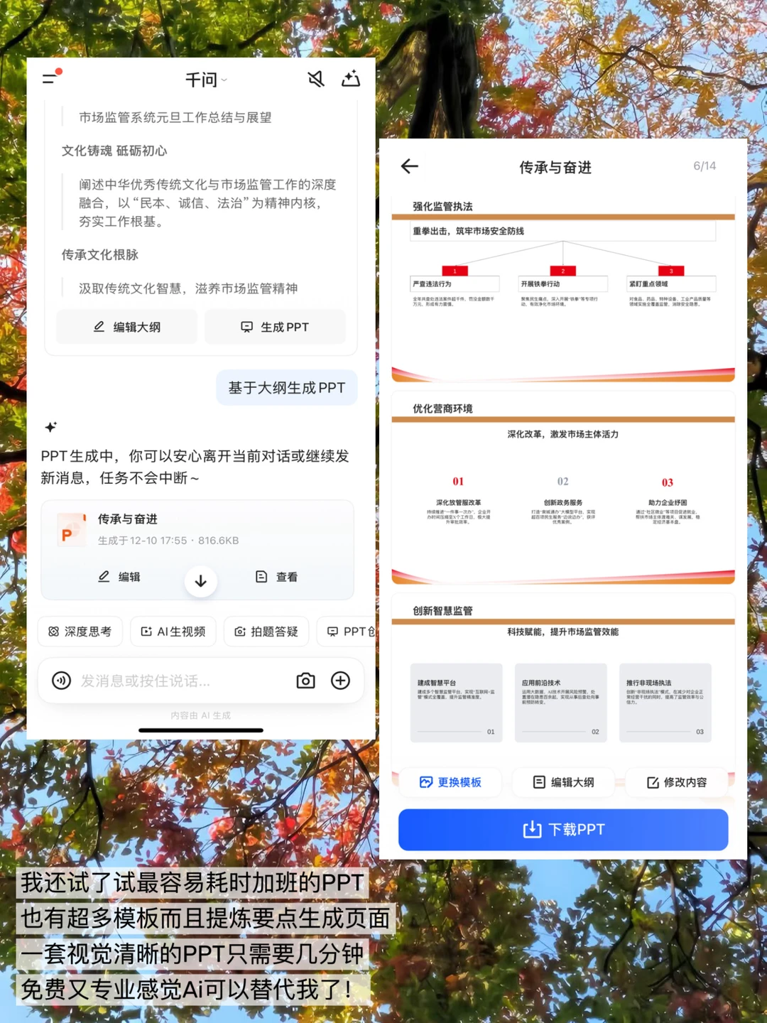 PPT制作以前是最容易耗时加班的,这次用AI PPT功能自动匹配模板、提炼要点、生成页面,一整套视觉清晰的PPT只需要几分钟[飞盘R]免费又专业,听说还能用来给小孩讲题,怪不得刷新闻说千问C端月活跃用户3000万!用好工具不是偷懒,而是把自己从重复劳动中解放出来,让自己专注于思考和决策,就像领导一样!