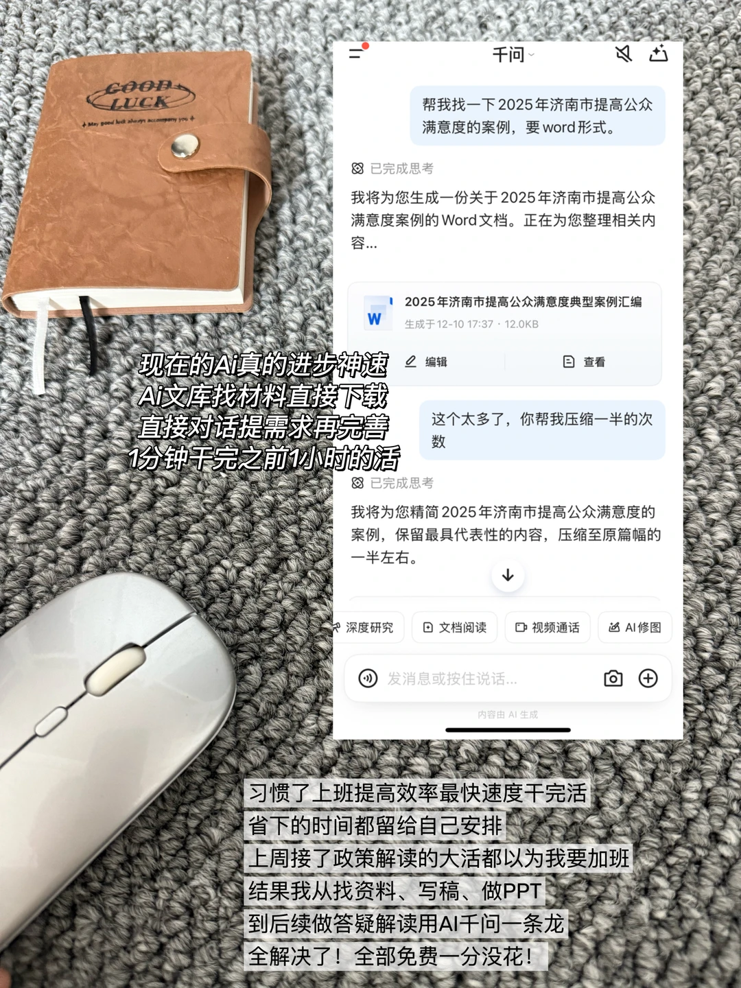 我习惯了上班提高效率用最快的速度干完活,省下的时间都留给自己。上周接了政策解读的大活都以为我要加班,结果我从找资料、写稿、做PPT[清单R]到后续做答疑用AI千问一条龙全解决了,免费一分没花!首先找案例不用全网盲目搜索,直接用AI文库,输关键词找到相关行业报告、政策解读,再用AI文档对话式描述写稿需求,一句话生成结构清晰的文档,顺便把格式都转好了。