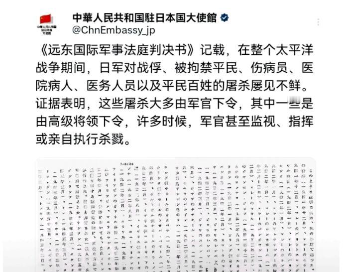 终于到这个环节了,中国驻日本大使馆今天(12月11日)发文写道:“《远东国际军事法庭判决书》记载,在整个太平洋战争期间,日军对战俘、被拘禁平民、伤病员、医院病人、医务人员以及平民百姓的屠杀屡见不鲜。证据表明,这些屠杀大多由军官下令,其中一些是由高级将领下令,许多时候,军官甚至监视、指挥或亲自执行杀戮。” 这事儿搁2025年的节点上提,可不是翻旧账这么简单。就在同一天,使馆还在催在日中国人赶紧用"中国领事"APP登记,因为日本刚经历7.6级地震,东京直下型地震预测能死1万8千人。两件事凑一块儿,像面镜子照出了中日关系里最扎心的现实。 先说这历史判决书,我查过,当年法庭认定日军屠杀是系统性犯罪,从南京到马尼拉,军官带着士兵杀俘虐民,连医院都不放过。现在驻日使馆重提这些,不是要跟日本老百姓过不去,而是冲着那些至今不认错的政客去的。 你看,今年11月外交部刚提醒中国人别去日本,理由除了地震,还有"针对中国人的犯罪多发",甚至日本领导人公开拿台湾挑事。这边厢中国留学生在日本被袭击的案子破不了,那边靖国神社的香火照样旺,历史课本还在改侵略为"进出"。 这种情况下,使馆搬出70多年前的铁证,就是要在日本人耳边敲警钟:你们政府嘴里的"反省",连自己的法庭记录都盖不住。 再说领事保护这事儿,现在在日中国人有70多万,使馆这两年特别拼。去年提醒别打黑工,今年盯着地震海啸,连登记APP都手把手教。为啥这么上心?看看素材里的细节:2017年日本留华毕业生有24万,2015年中日口腔医学交流热热闹闹,可到了2025年,使馆连发警告,从治安到地震,从打工陷阱到历史问题。 这不是单方面疏远,而是现实倒逼。就说今年12月8日的地震,青森县晃完,东京预测模型算出83万亿日元损失,相当于每个日本人摊6万多人民币。这种时候,中国政府能做的,就是把70万同胞的位置摸清楚,哪个在东京,哪个在海边,万一真出事,救援队能按图索骥。 有人可能纳闷,为啥非要在发地震提醒的时候提历史?其实这俩事儿根子连着。日本政府一边搞"科学预测"算地震损失,一边在历史问题上搞"选择性失忆"。就像法庭记录里写的,当年日军屠杀是"军官监视、指挥或亲自执行",现在日本某些政客参拜靖国神社,不也是在"监视"历史修正主义吗? 这种矛盾,让在日中国人处境微妙:一边是学日语、交朋友的日常,一边是时不时冒出来的右翼标语;一边是地震时的互助,一边是教科书里的否认。使馆这时候把历史和现实摆在一起,等于在告诉同胞:咱们不惹事,但也不怕事,保护你们的安全,是基于历史和现实的双重清醒。 还有个细节值得琢磨:2018年使馆提醒别打黑工,2025年升级成"避免前往日本"。这种变化,反映的是民间交流的降温。记得2017年日本留华毕业生聚会,有人说"在中国留学是最难忘的经历",可现在呢?今年11月外交部的警告里,直接提到"日本领导人涉台言论恶化氛围"。 当官方层面的挑衅影响到民间安全,领事保护就得升级。就像这次地震登记,表面看是技术活儿,背后是70万人的安危,万一真有大震,使馆得知道多少人住在海啸警戒区,多少人需要特殊救援。这种细致,恰恰是因为历史教训太深刻:当年日军屠杀时,连红十字会的船都敢炸,现在咱们自己的同胞,绝不能再陷入无保护的境地。 总之,今天使馆的两篇发文,表面看是历史与防灾的巧合,实则是中国外交最朴素的逻辑:记住昨天的血,才能护住今天的人。当日本某些势力还在否认屠杀命令时,中国政府已经在为每一个在日同胞的明天做打算。 这不是对抗,而是一个负责任大国的底线,历史可以宽恕,但教训必须铭记;交流可以继续,但安全必须优先。毕竟,70万同胞的安危,比任何外交辞令都更重。
