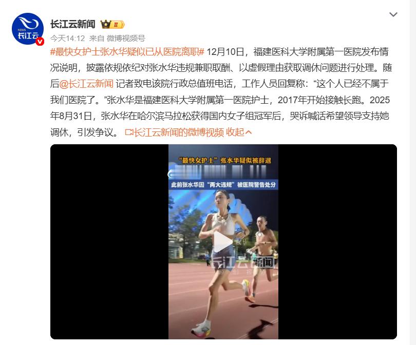 最快女护士张水华疑似已从医院离职 不如一别两宽、各自安好此后,你走阳关道,他走独木桥之后你每个周末都可以尽情奔跑,他们再没办法给你安排周末的工作只是,以后就不能挂着标签“最快女护士”了热点观点 ,最快女护士曾说不会辞职去跑马 ,医院回应最快女护士张水华被处分
