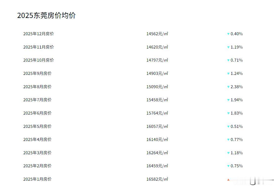 2025年1月,东莞二手房均价16582元; 2025年2月,东莞二手房均价16459元; 2025年3月,东莞二手房均价16264元; 2025年4月,东莞二手房均价16140元; 2025年5月,东莞二手房均价16057元; 2025年6月,东莞二手房均价15764元; 2025年7月,东莞二手房均价15458元; 2025年8月,东莞二手房均价15090元; 2025年9月,东莞二手房均价14903元; 2025年10月,东莞二手房均价14797元; 2025年11月,东莞二手房均价14620元。 2025年11月东莞二手房房价均价比2025年1月下降约1900元,比2022年的22079元下降了约7459元。从2022年开始,平均每年下降约2000元。 未来,东莞的房价,肯定会到底后保持平稳的状态。长期来看,房价主要还是和经济发展、人口增长等因素有关。 那么大家觉得未来东莞的房价均价在哪个区间比较合理,评论区聊一聊。