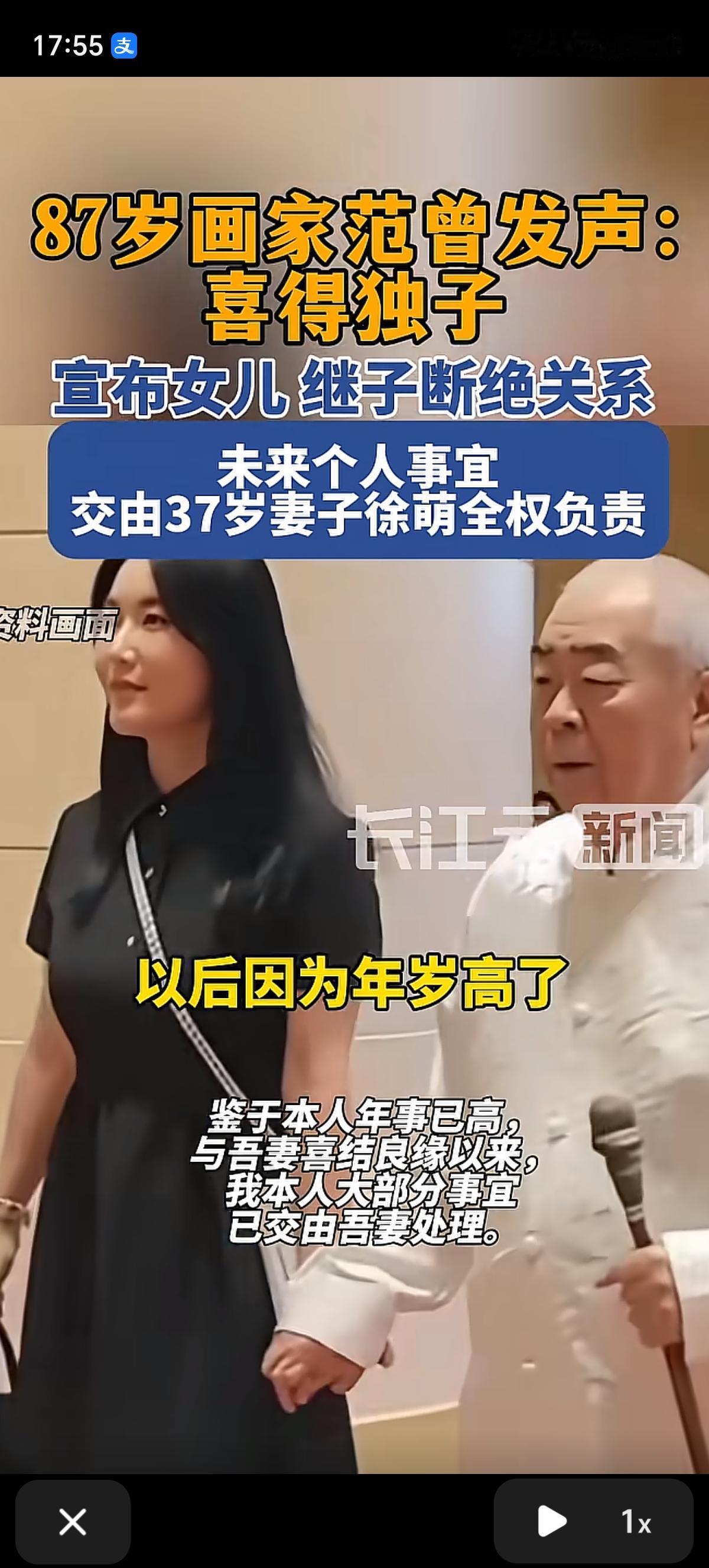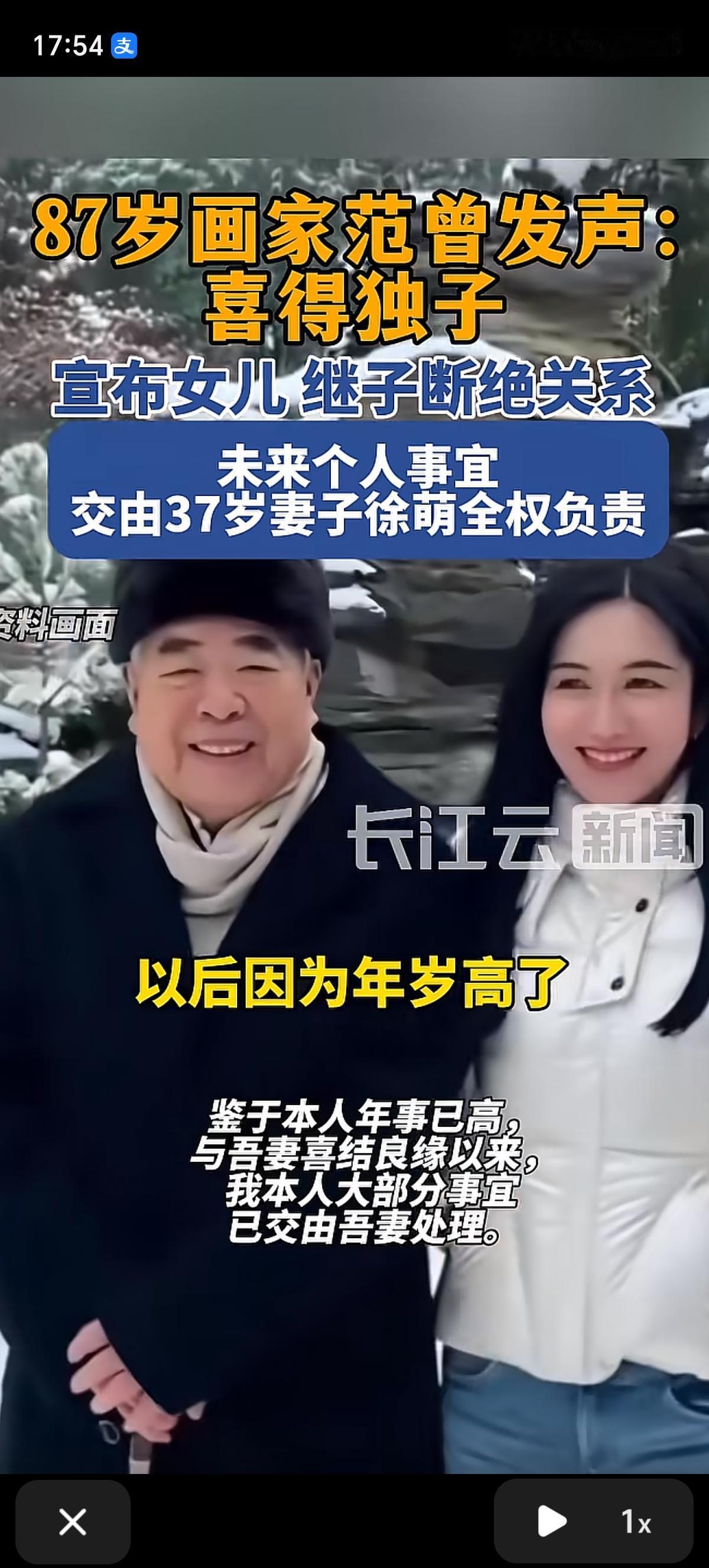 12月11日87岁画家范增发声喜得独子,同时宣布和亲生女儿、继子断绝关系,未来个人事宜全权交给37岁爱妻徐萌负责。 12月11号这天,87岁的书画界大佬范曾直接在微博扔了个“深水炸弹”,一条声明把全网都炸懵了! 声明里藏着俩大新闻,先是官宣自己和37岁的妻子徐萌喜得独子,现在一家三口已经搬到新居,就想安安稳稳过日子。更让人意外的是,他说自己年纪大了,往后不管是私事还是公事,全都交给徐萌全权负责,别人压根没资格插手。 但比“老来得子”更劲爆的是,范曾直接宣布和亲生女儿范晓蕙、继子范仲达彻底断绝关系!不光以后不往来,之前给这俩人还有他们家属相关公司的授权和委托也全撤了,还警告不准再用他的名义对外做事。至于为啥这么决绝,他说有人借着“子女”的名义瞎编事实、诽谤他和徐萌,甚至威胁到一家三口的安全,实在没法忍才出此下策。 其实这不是范曾第一次引发热议了,今年8月就闹过“失联风波”——当时女儿范晓蕙发文说爸爸被徐萌带走后就联系不上了,家里好几处房子被封,估值20亿的藏品也被搬走了,可徐萌那时候压根没回应。这次范曾特意用手书钤印的方式发声明,就是想证明这些决定都是自己心甘情愿的,不是被人逼迫的。 另外他还划清了后续的办事渠道:公益方面只通过北京十翼文化艺术基金会,商业上的事就交给十翼范曾(北京)文化艺术有限公司,等于把后路都安排得明明白白。 这事一出来,网友直接吵翻了天。有人觉得87岁还能得子太不可思议,吐槽情节比微短剧还狗血;也有人骂范曾绝情,有了新老婆和小儿子就不认亲闺女、继子,血缘亲情说断就断;更多人琢磨着这背后肯定是财产分配的事儿,毕竟范曾的书画和资产价值不菲,现在有了小儿子,遗产继承格局肯定变了。 至于这声明在法律上能不能算数,亲情是不是一纸声明就能切断,大家也吵得不可开交。只能说豪门的家务事,果然比普通人的复杂多了,后续还会不会有新动静,只能等着看了。