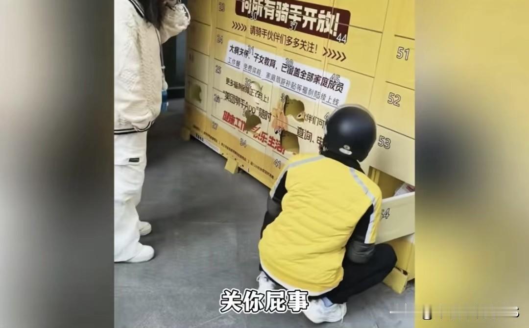 女子把外卖柜当圣诞盲盒狂踹,外卖小哥好心提醒反被怼到自闭 小仙女接了个电话后,跟进入生化模式似的,跑到外卖柜那儿,把外卖柜当成圣诞盲盒了,一脚一个狂踹,好几 个柜子都被踹凹下去了,边踹还边大喊“快哉快哉”。 有个外卖小哥正蹲地上准备放餐,好心提醒了句“里面有外卖”,结果反被小仙女怼了句“关你屁事”。小哥在据理力争和生气反击之间,只能委屈瘪嘴地把外卖拿出快递柜,生怕自己也被踹,到时候还得赔钱给顾客。而那小仙女踹完就潇洒转身走了。 这可苦了那些急着来拿外卖的食客,这一系列操作,真是让人看不懂,对此你怎么看?