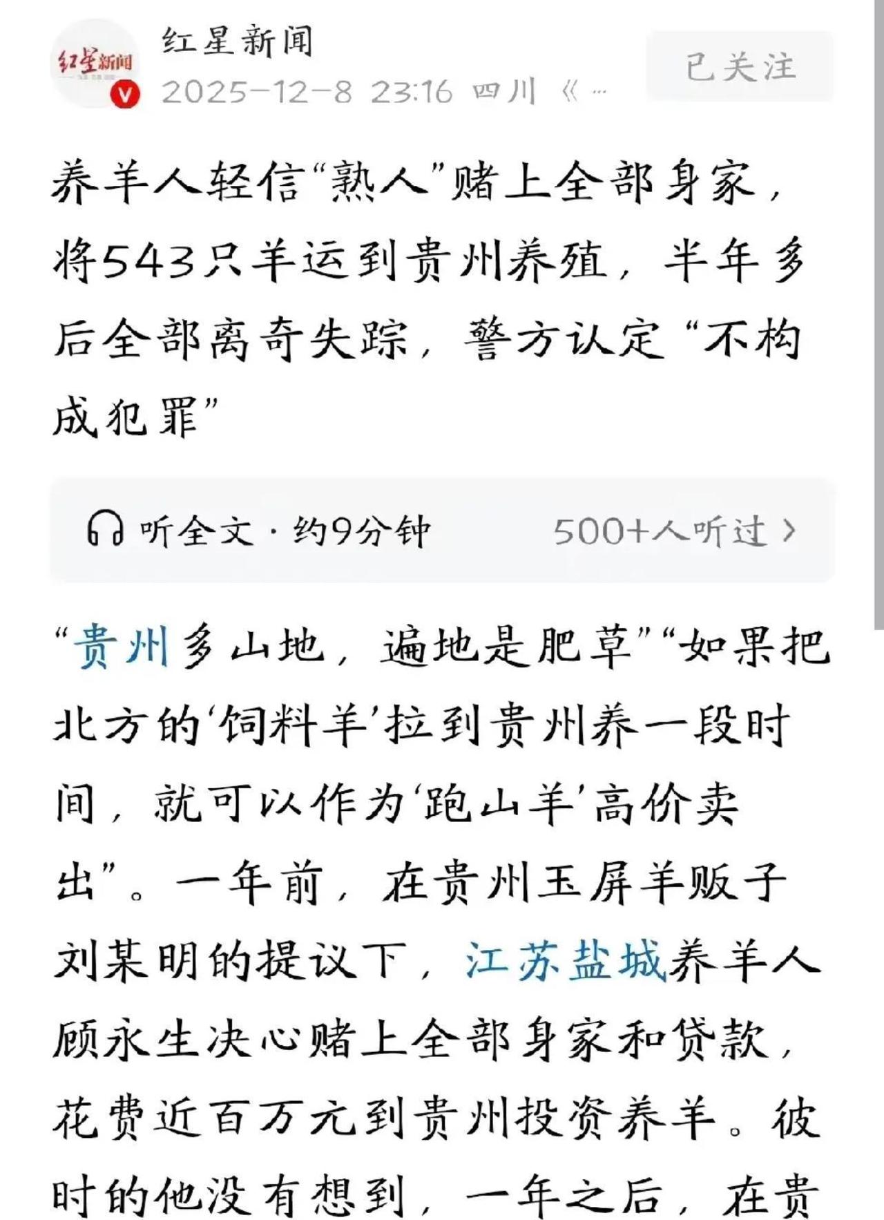贵州一男的听熟人说养羊赚钱,贷了89万从河南买回543只羊,运到玉屏养,说好卖了给那熟人点辛苦费,结果羊混一块养,熟人偷偷把他的羊换掉去卖,半年时间,543只剩120多只,男的报警,警察说这是经济纠纷,不立案,熟人转头把剩下的羊也占了,人跑了找不着。 货车开进玉屏山区那天,顾某特意穿了件新衬衫,后斗里543只羊挤得满满当当,黑白相间的毛蹭着车厢板,他数了三遍,心里默念“一只羊赚200,一年就能回本”。 介绍这门“稳赚不赔”生意的是同村的刘某,两人小时候一起爬过树掏过鸟窝。刘某说他表哥在河南养羊发了财,“你出钱我出力,卖了羊分我三成辛苦费就行”。 顾某动了心。他跑了三家银行,用老屋作抵押贷了89万,“每月利息4200块,想着年底卖羊就能还上”。羊运到的第二天,刘某就把自家200多只本地羊赶过来,“混着养省事,一起喂一起放”。 问题出在羊耳朵上。顾某怕分不清,给每只河南羊的左耳剪了个小缺口。第三个月,他发现带缺口的羊少了——原本543只,某天点数只剩380只。 “山里野兽多,可能跑丢了。”刘某蹲在羊圈边抽烟,顾某没在意。直到半年后,他拿着进货单核对,带缺口的羊一只都没了,总数只剩120多只,全是刘某那批老弱羊。 “400多只羊去哪了?”顾某把单子拍在桌上,刘某眼神飘向墙角,“病死了一些,山洪冲走了一些,养殖哪有没损耗的?” 顾某报了警。派出所里,民警看着两张模糊的“合伙”字条,“这是经济纠纷,你们自己协商,或者去法院起诉”。 这话让刘某放了心。三天后的清晨,顾某去喂羊时,羊圈空了——剩下的120多只羊被刘某连夜拉走,电话关机,家门上锁,邻居说“天没亮就雇了辆蓝色货车”。 老婆知道后,当场晕了过去,躺床上起不来。顾某再去派出所,带着医院的诊断书,民警才改口“涉嫌诈骗,先立案调查”。可半个月后,案子又撤了,“刘某说羊是他的,只是帮顾某代养,构不成犯罪”。 街坊们议论纷纷。有人说顾某太实诚,“羊混养就像钱放别人口袋,能不丢吗”;也有人骂刘某黑,“拿人家的羊去卖,这跟偷有啥区别?” 现在顾某请了律师,准备打官司。律师说“刘某的行为可能构成盗窃,但案子撤了,想翻过来难”。89万的贷款压着,他白天在工地搬砖,晚上守着空荡荡的羊圈,“当初货车上活蹦乱跳的543只羊,现在只剩墙上没撕干净的‘招财进宝’春联”。 这事儿像面镜子——熟人介绍的生意,真能全信吗?羊混养时,是不是该每天点数?发现数量不对时,是不是该早点止损? 你们觉得,这事儿警方该不该重新立案