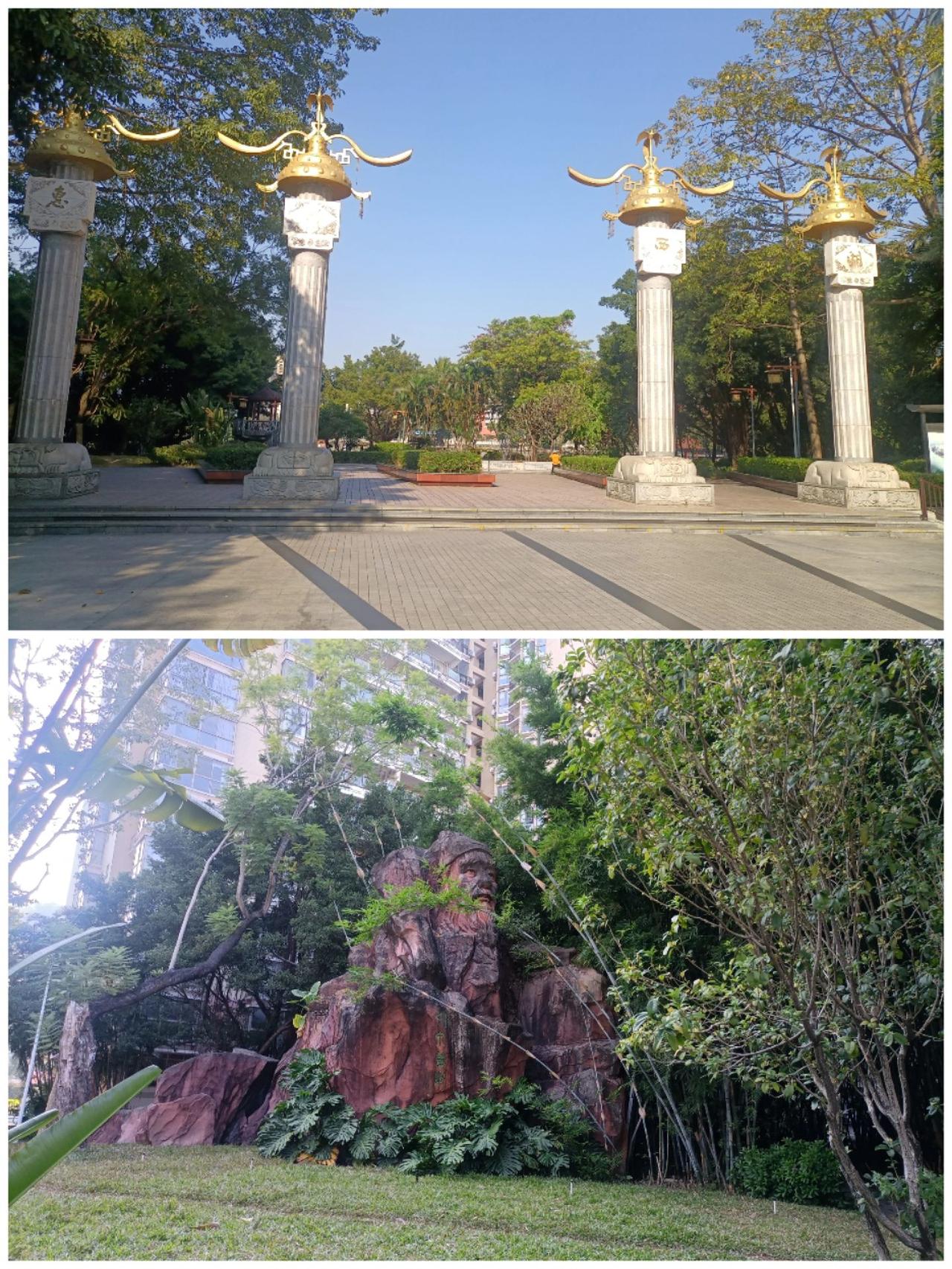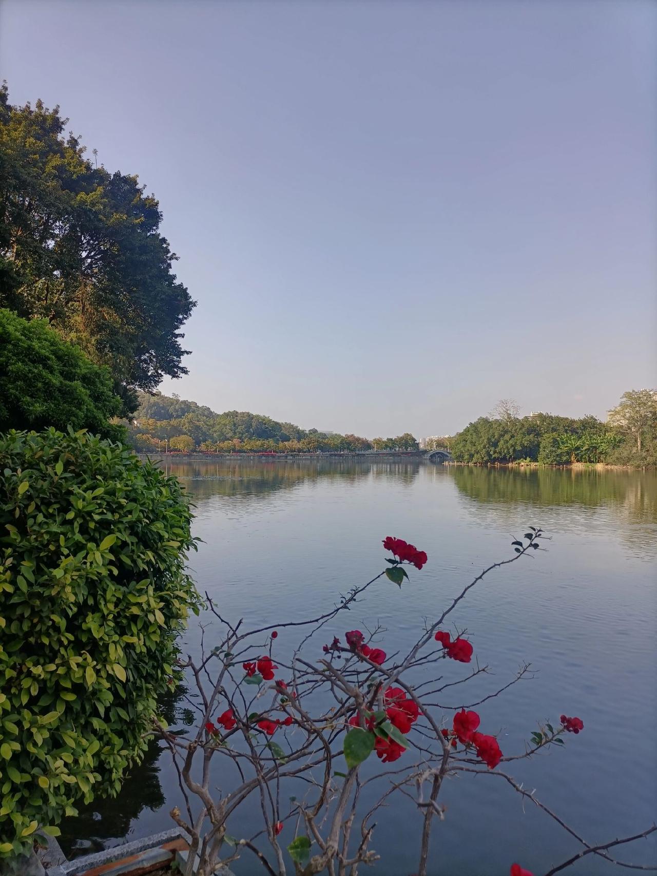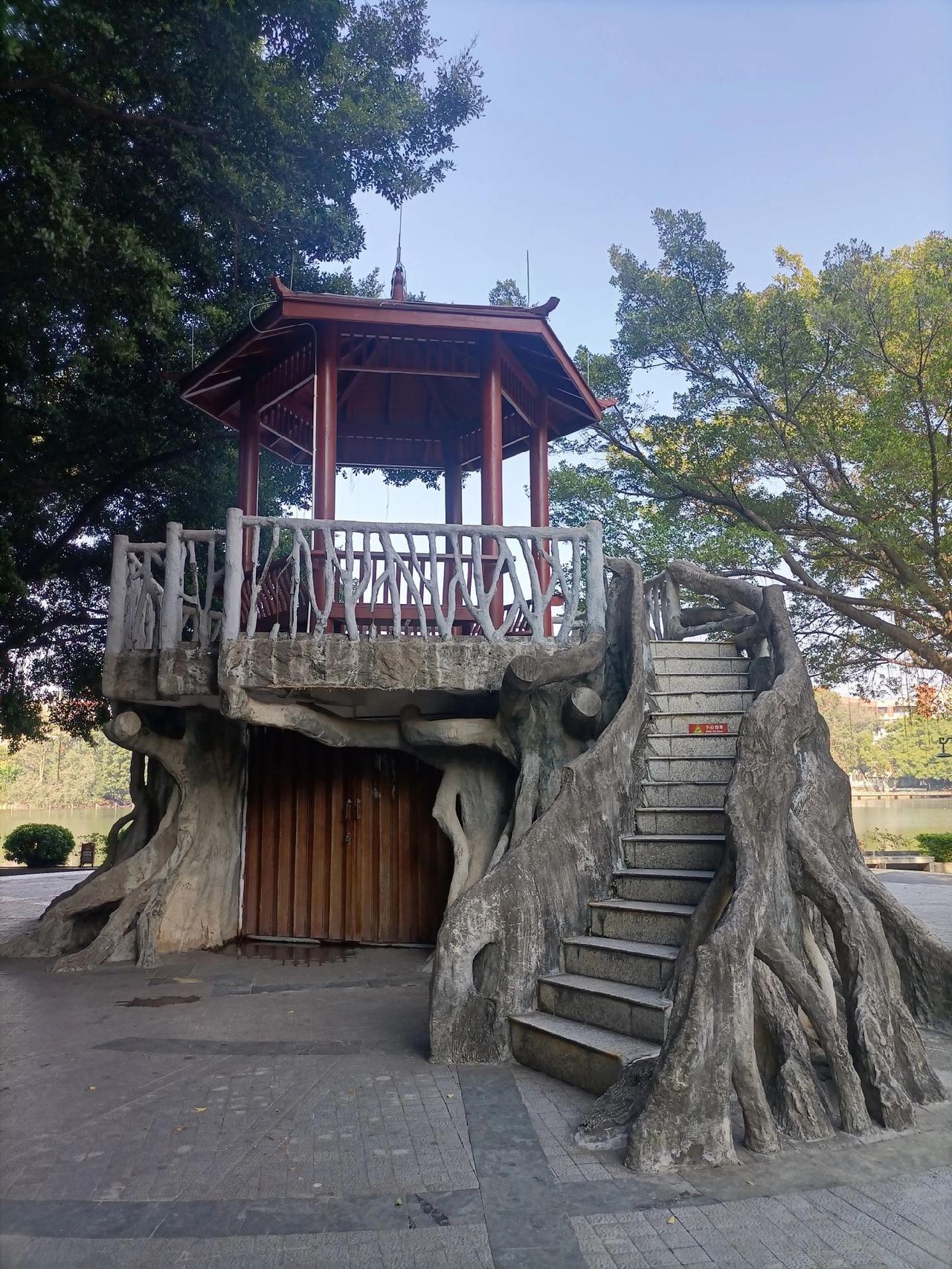 又到惠州,游览南湖公园,金凤凰图腾非常别致(图1),四根金顶罗马柱和岩石雕像充分展示了美和艺术(图2),独特的树根状高台阶八角亭与众不同(图3)。 湖景一绝,令人眼前一亮,九曲亭台红花醉(图4),山水倒影娇蕊艳(图5),碧池小桥农人忙(图6),随走随拍全是景(图7-9)[呲牙][强]。 惠州 公园 山水之间任逍遥