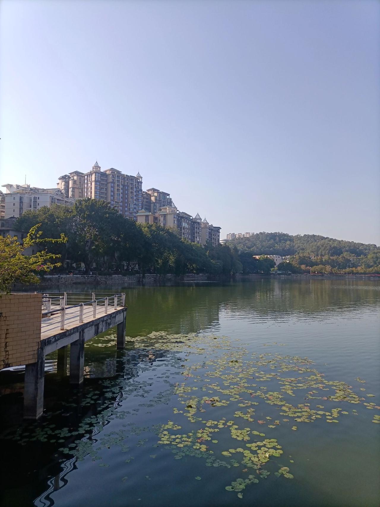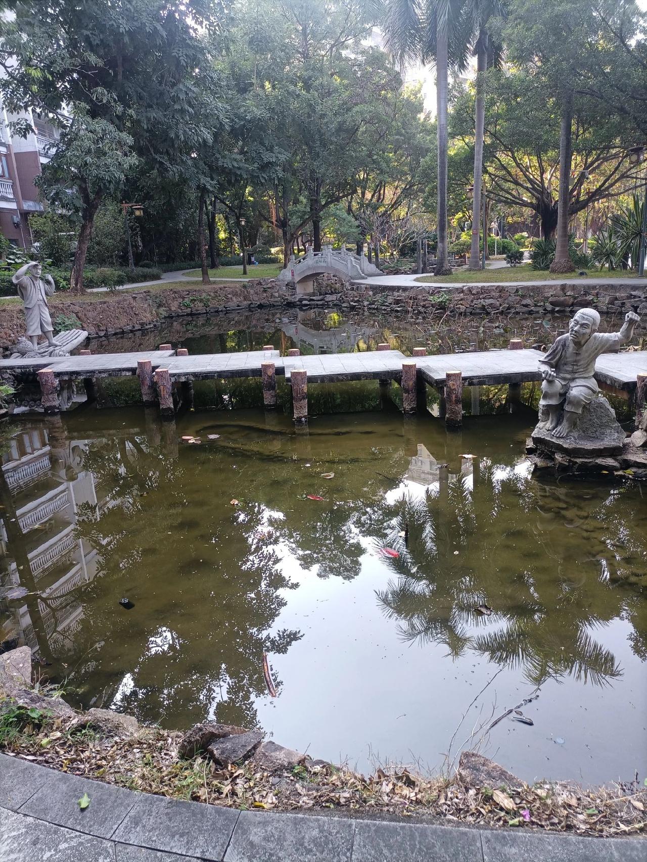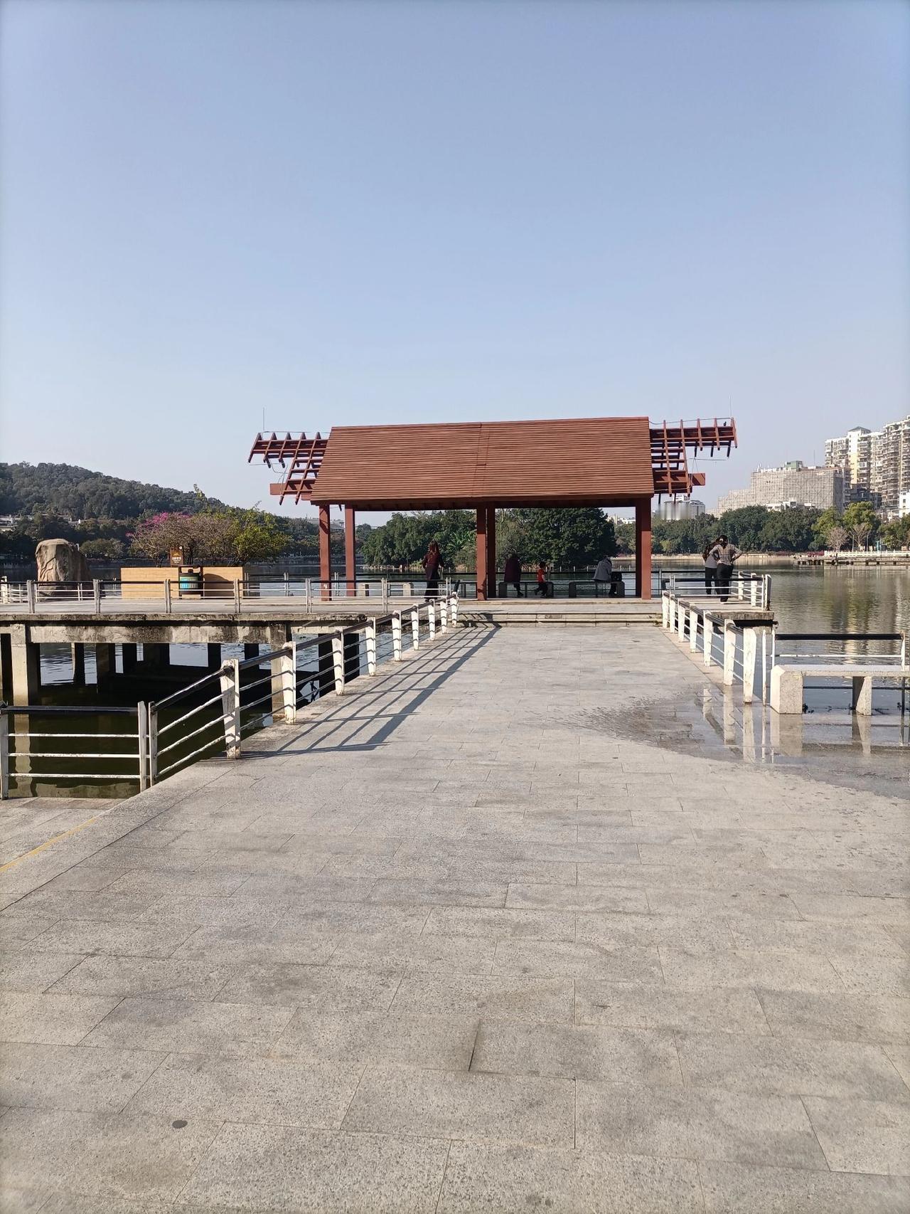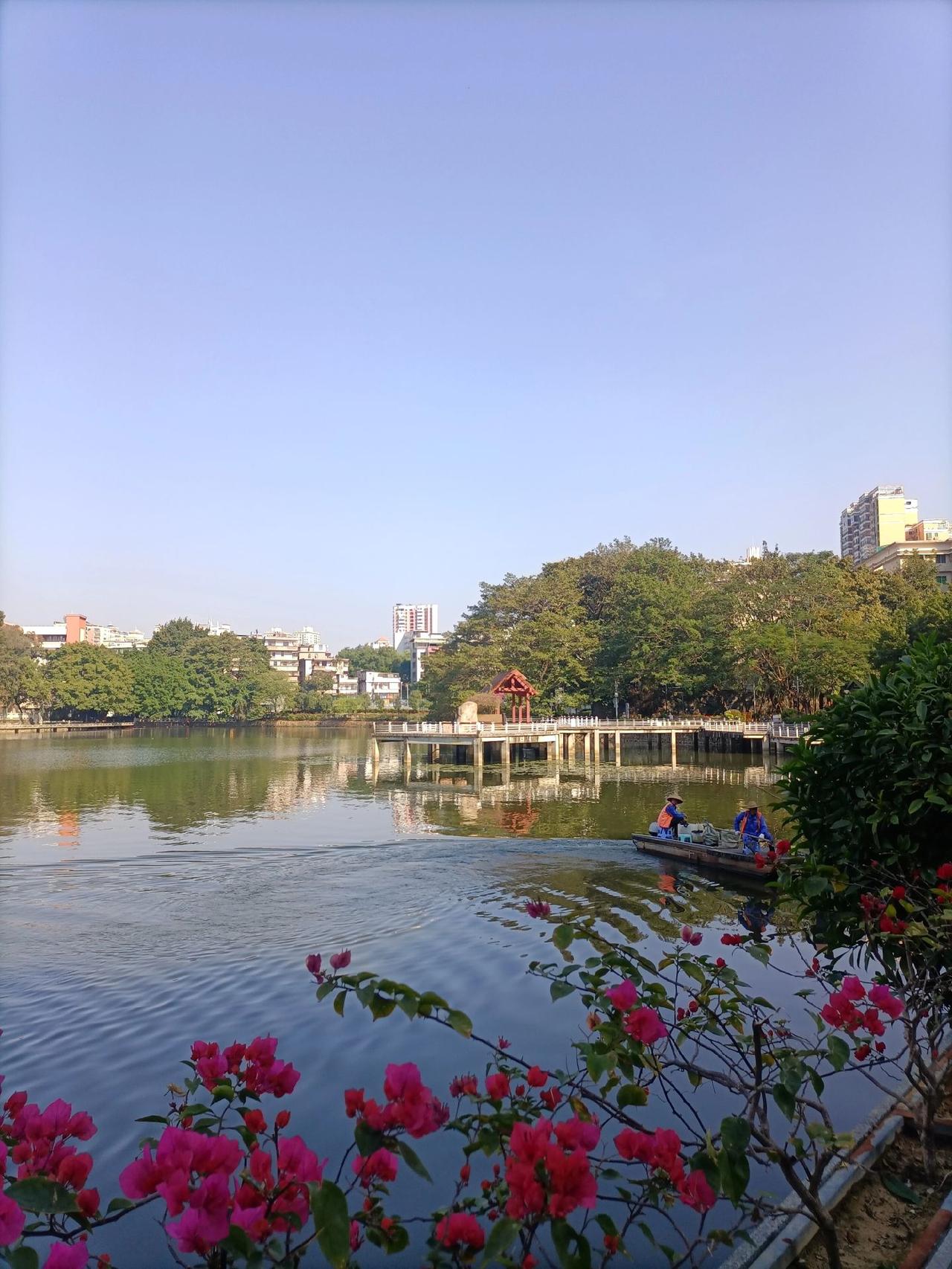又到惠州,游览南湖公园,金凤凰图腾非常别致(图1),四根金顶罗马柱和岩石雕像充分展示了美和艺术(图2),独特的树根状高台阶八角亭与众不同(图3)。 湖景一绝,令人眼前一亮,九曲亭台红花醉(图4),山水倒影娇蕊艳(图5),碧池小桥农人忙(图6),随走随拍全是景(图7-9)[呲牙][强]。 惠州 公园 山水之间任逍遥