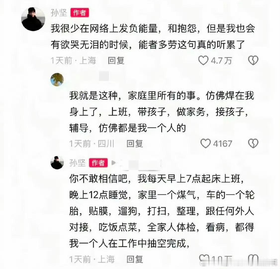 我不认为孙坚和网友诉苦是在卖惨, 我只觉得明星也是普通人,有情绪也需要发泄! 孙坚家境普通,全靠自己进入内娱打拼事业,给妈妈买首饰,给没有血缘关系的弟弟帮扶,之前看他视频,他要管很多亲戚,很多事情就是他自己一个人做。 看他的视频眼睛都是红红的,肉眼可见的疲惫,他可能就是太累了,其实成年人的世界也是需要情绪宣泄的,憋在心里时间久了真的容易生病。 人都会有累的时候,只能说他作为公众人物确实是让大家觉得很光鲜亮丽然后也确实赚的多!他又没有塌房没有违法,也没有抱怨说自己的行业是高危啥的,大家还是多点理解与包容!