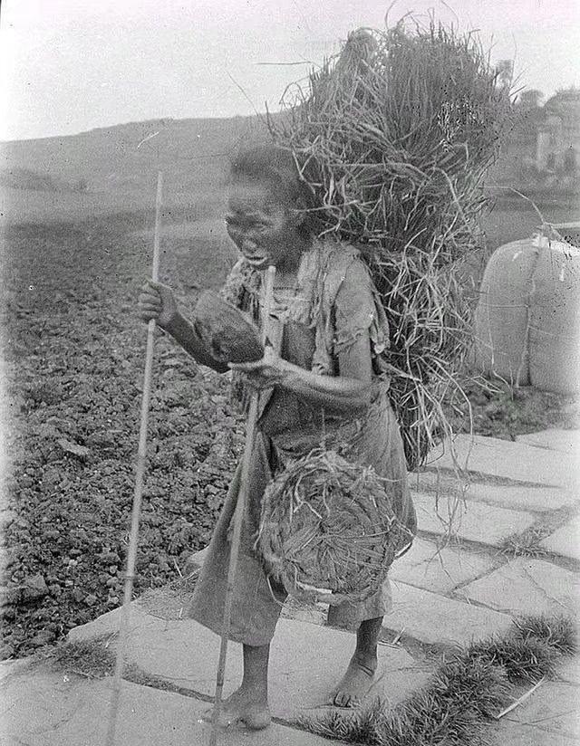 一个人活着, 需要什么呢? 背在背上的睡觉的稻草,挂在腰间的草坐垫,手里的空空的饭盆,兵荒马乱,阿婆还看不见。 她还是小脚! 我们走过的这一个多世纪,伴随着太对阵痛。人的苦,并不会因为时代的进步而改变,个人的苦难总是隐藏在荒芜之地。 这张图片的介绍是民国时期的四川遂宁一带。 她用一根拐棍来支撑身体,本是不便久站、不便走路的人,却要背负这么重的东西,生活之艰难可见一斑。 发展是硬道理, 贫穷只能挨饿, 落后就要挨打!