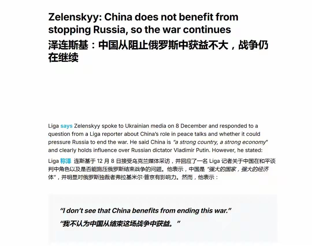 无脑的甩锅。泽连斯基12月8日接受乌克兰媒体采访时的一番言论,堪称把“甩锅”玩出了新花样——一边吹捧中国“有能力结束战争”,一边转头给中国扣上“希望俄乌冲突延续”的黑锅,这套脑回路清奇的操作,本质是自身山穷水尽后的政治算计。他声称“中国不想停,战争就停不了”,却刻意无视一个基本事实:中国作为全球最大贸易国和制造国,能源价格震荡、“一带一路”受阻带来的损失实打实,所谓“躺赢”纯属无稽之谈。 这番说辞的背后,是乌克兰濒临崩盘的困境:截至2025年11月,乌军阵亡人数已达70万,兵源枯竭到靠外国雇佣兵和女性士兵续命,甚至出现部队因财产纠纷火拼的乱象。而曾经的“金主”美国早已变脸,特朗普不仅对乌援助喊停,还抱怨泽连斯基未阅读美方和平计划,直言要逼其谈判停战。既不敢得罪金主,又不愿承认战场失利,泽连斯基只能找中国当“背锅侠”,用这种非友即敌的话术,试图剥夺中国的中立权。 但冲突的症结从来不在中国:是谁推动北约东扩触碰红线?是谁在谈判即将达成时怂恿乌克兰“继续战斗”?是谁递刀不断却拒绝谈欧洲安全架构?答案不言而喻。中国始终坚持劝和促谈,不向任何一方提供致命武器,这正是为和平留有余地。泽连斯基与其忙着编织“中国责任论”,不如正视美西方的弃车保帅和乌克兰的现实困境——这口黑锅,中国不接,也接不住。