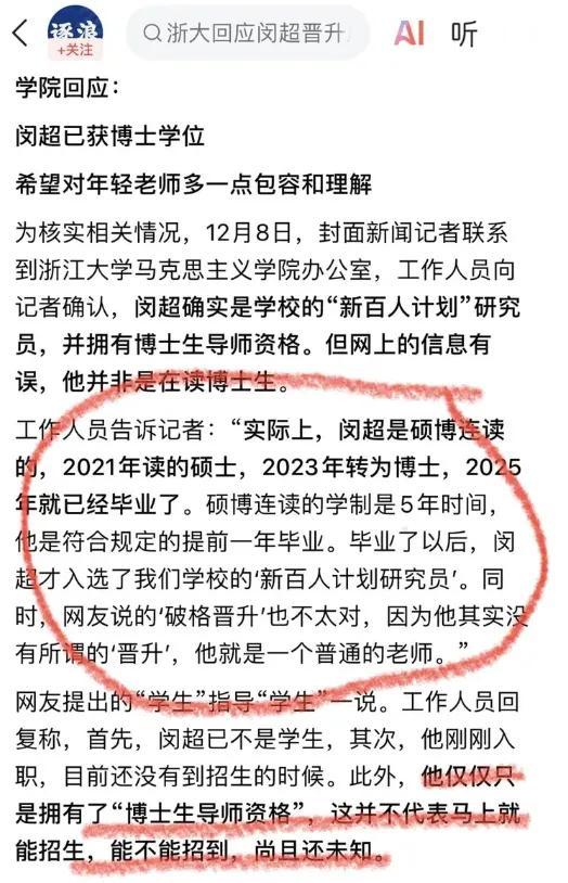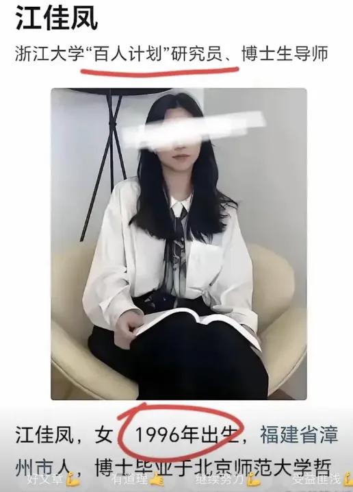 26岁当博导?浙大百人计划又添新案例,这次是29岁的江佳凤!网友炸锅!本科非985,成果仅6篇论文,凭啥? 其实,高校抢人才就像风险投资。赌的是年轻人未来的潜力,而不是过去的资历。学校一次性给足博导职位和资源,签的却是对赌协议。成了就是学术明星,输了可能迅速凋零。 有人调侃文科成果难量化,到底是弯道超车还是规则漏洞?也有网友直言!这种模式好比高速路没护栏,翻车风险太大! 争议背后,折射出高校人才引进的玩法变了。要么押注未来,要么步步稳扎稳打。你看好这种学术风投吗?