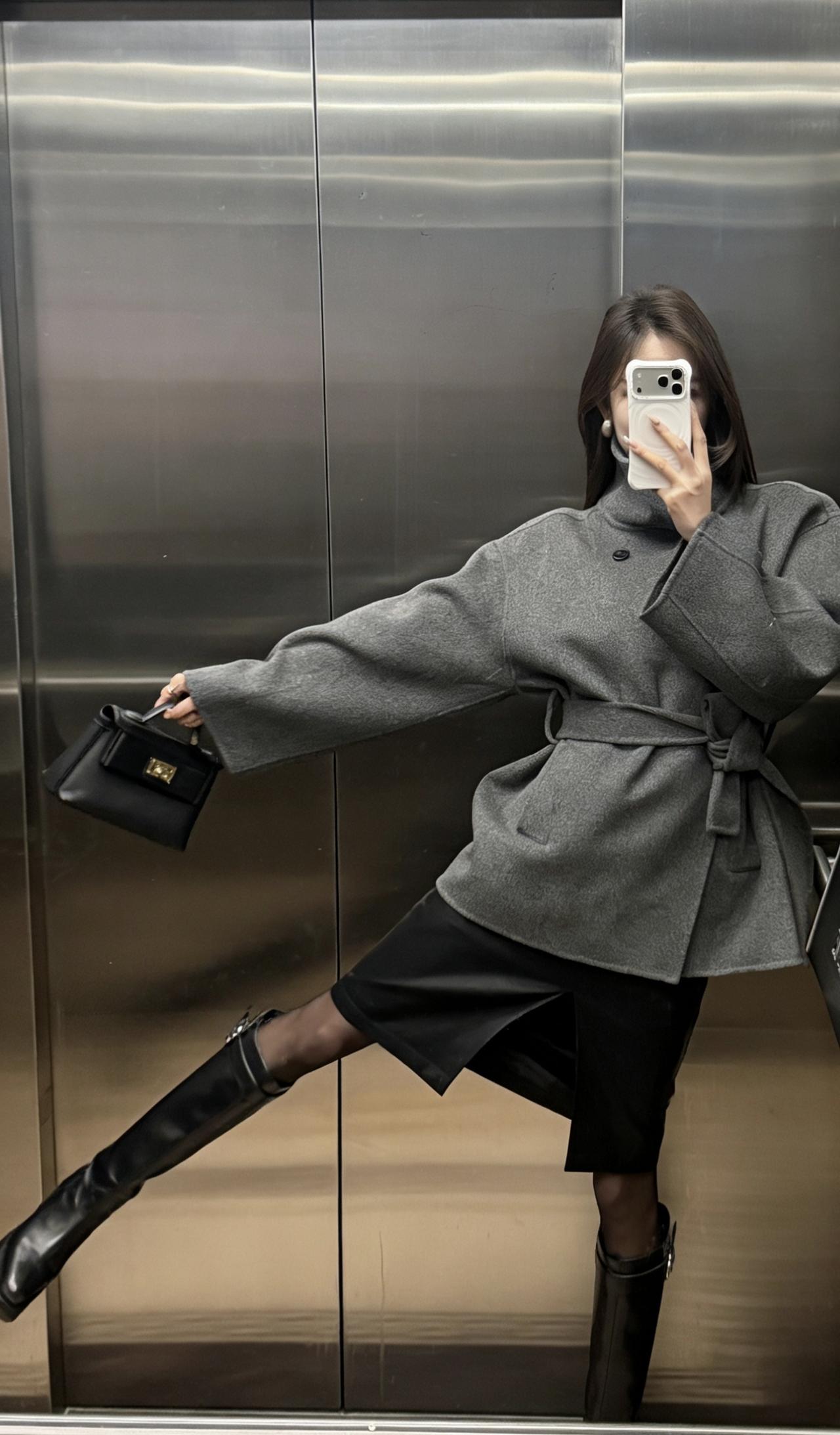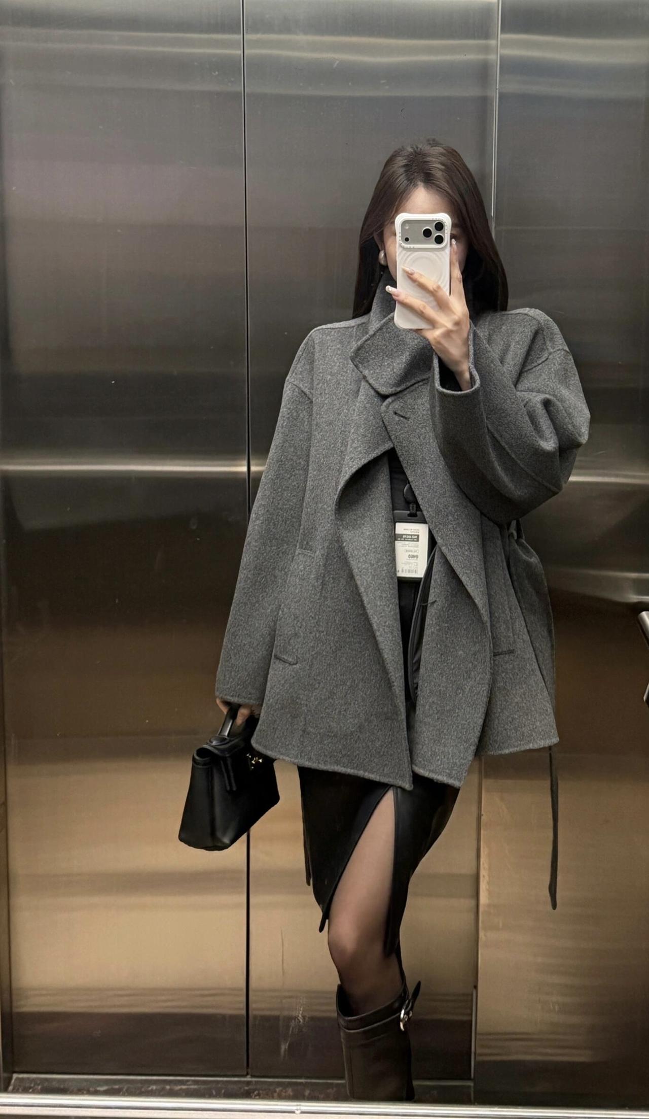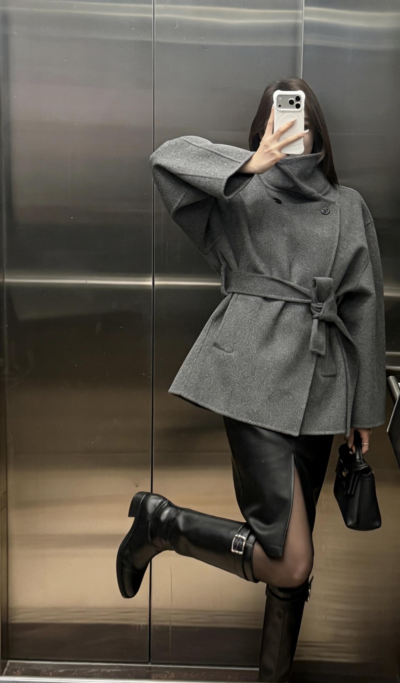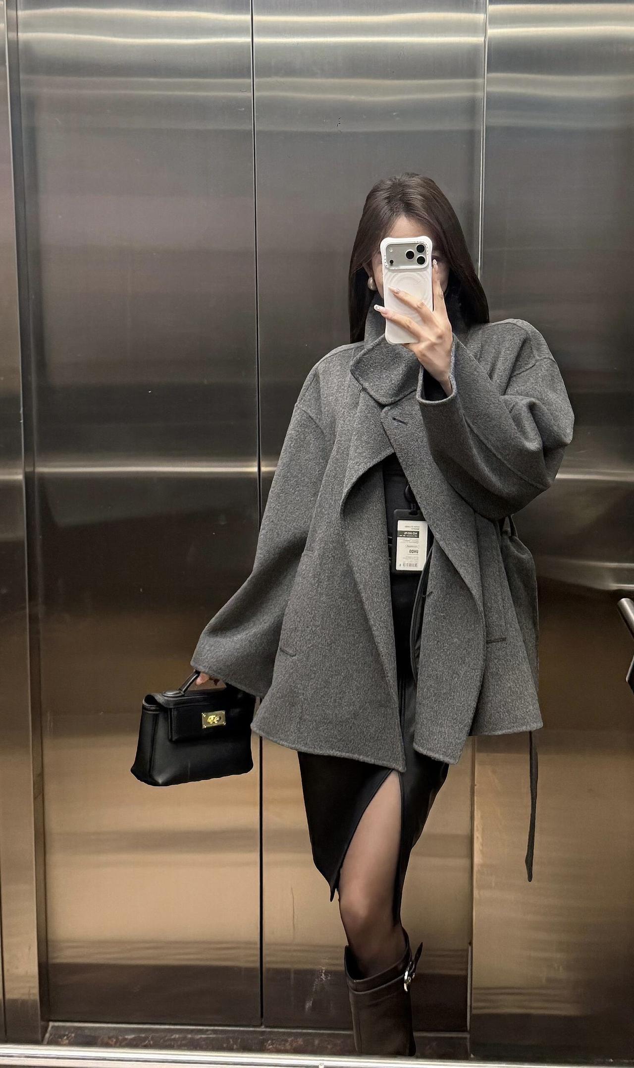 今日穿搭推荐:灰色收腰毛呢短大衣为主打,搭配黑色开叉皮裙、黑丝与黑色长筒靴,手持黑色迷你手拎包,整体走轻熟风+都市通勤风路线,兼具质感与女性化的精致感: 灰色毛呢大衣:短款收腰设计勾勒腰线,毛呢材质自带高级感,灰色系低调又百搭,是秋冬氛围感的核心单品; 黑色下装组合:开叉皮裙增加了设计感与小性感,黑丝+长靴的搭配中和了皮裙的硬朗,同时拉长腿部线条; 配饰:黑色迷你手拎包小巧精致,与整体黑灰配色呼应,提升了造型的精致度。 适合的场合 日常通勤、逛街、下午茶、轻商务场合,简约而不简单。