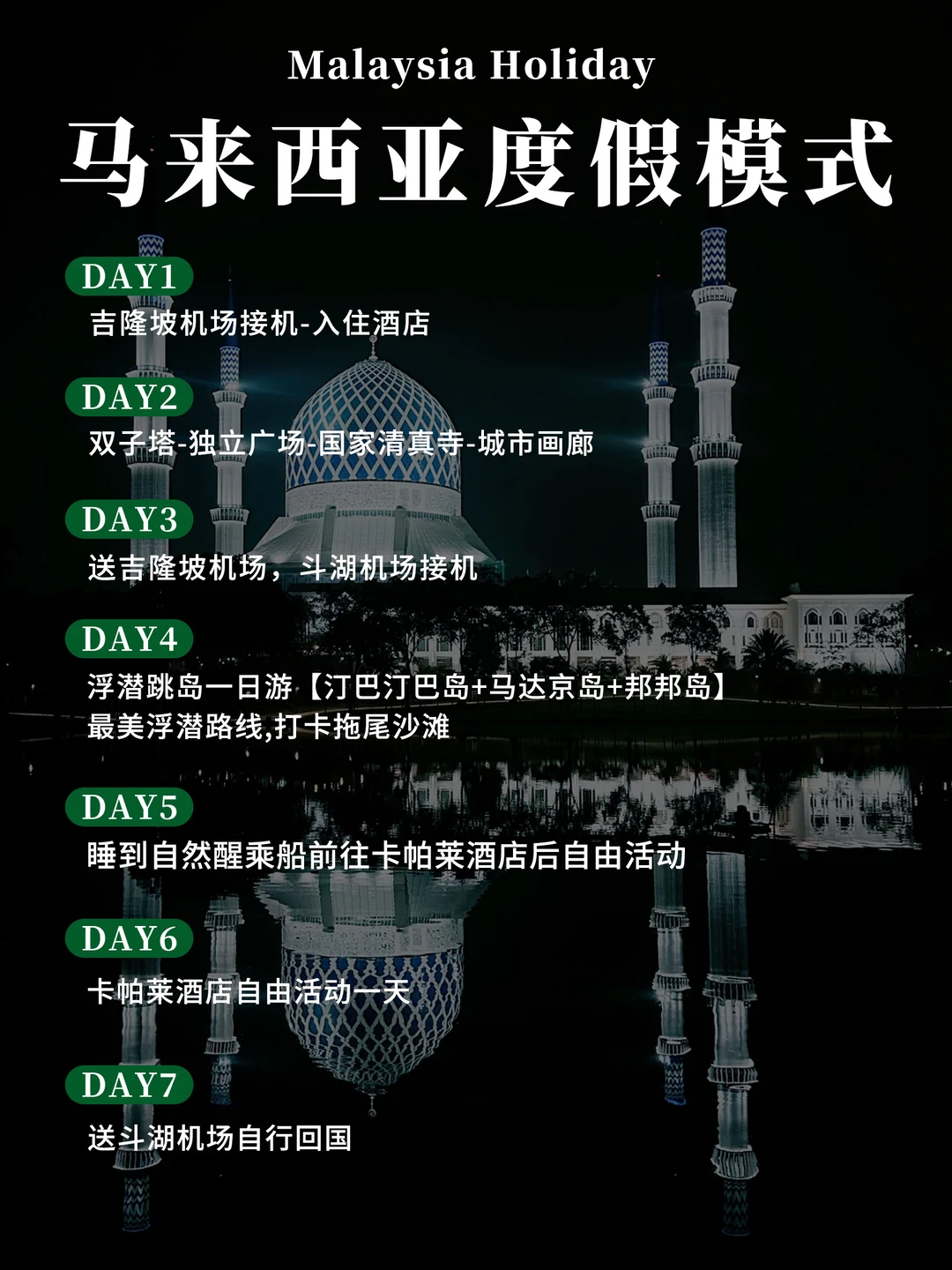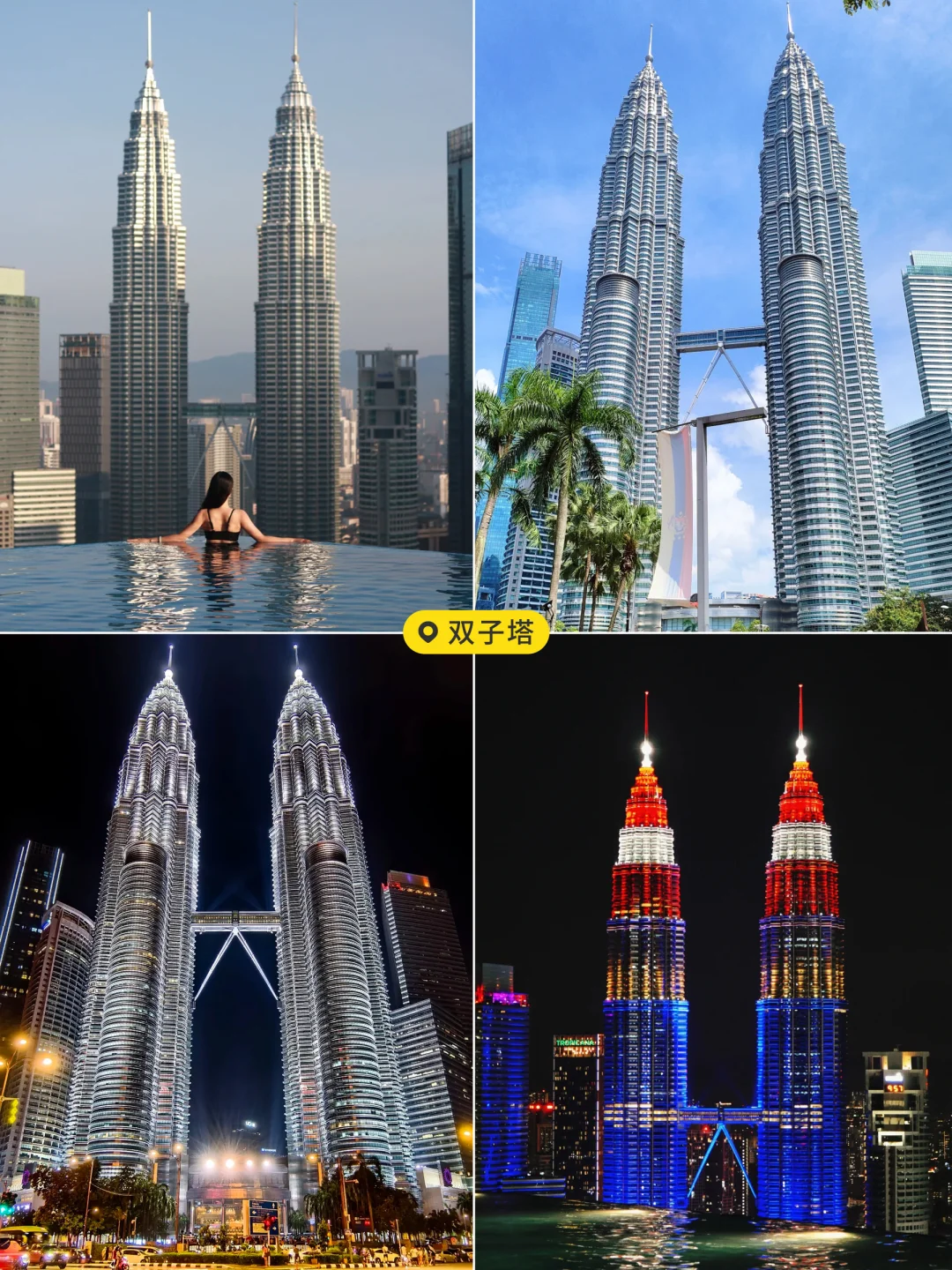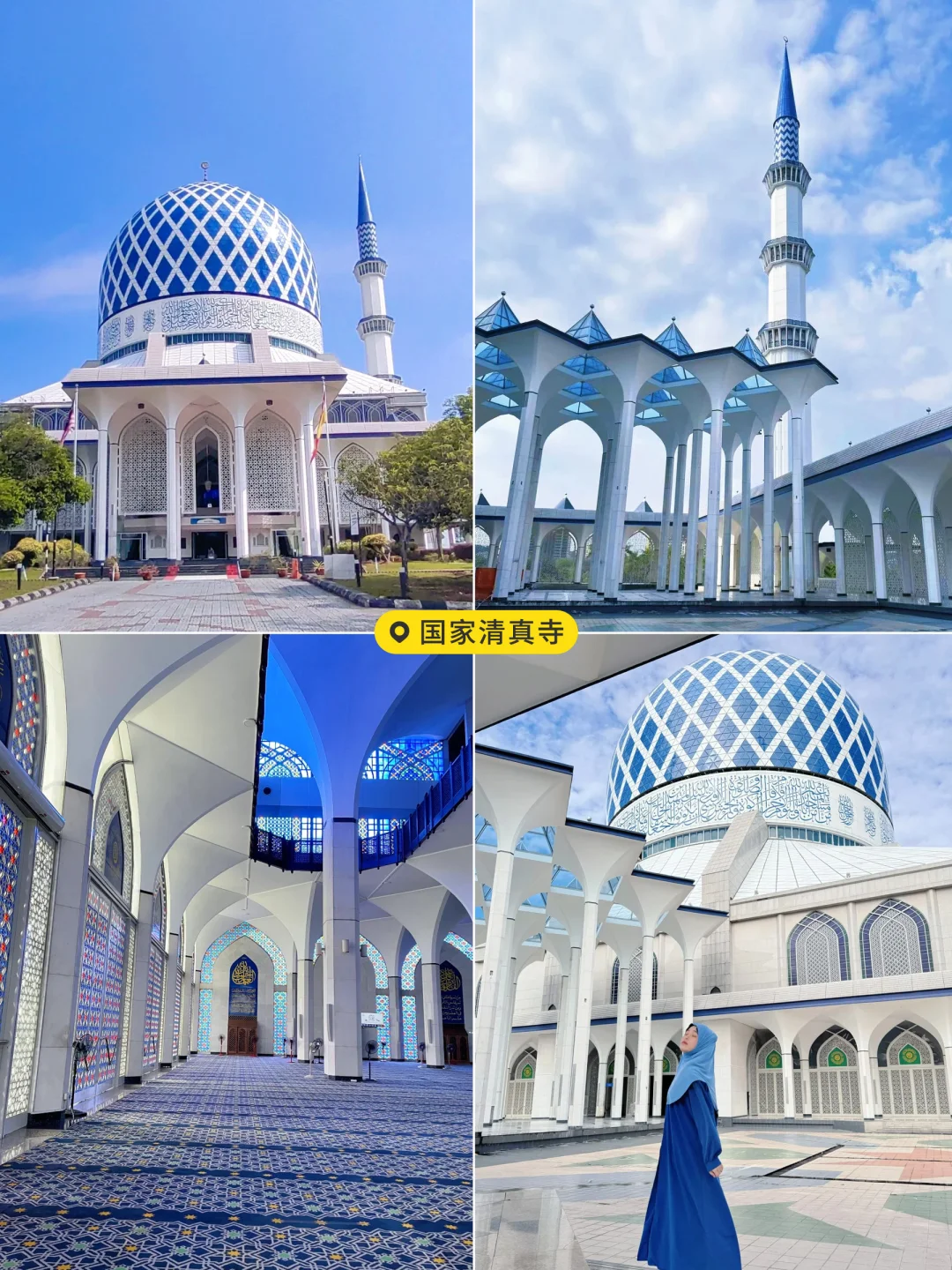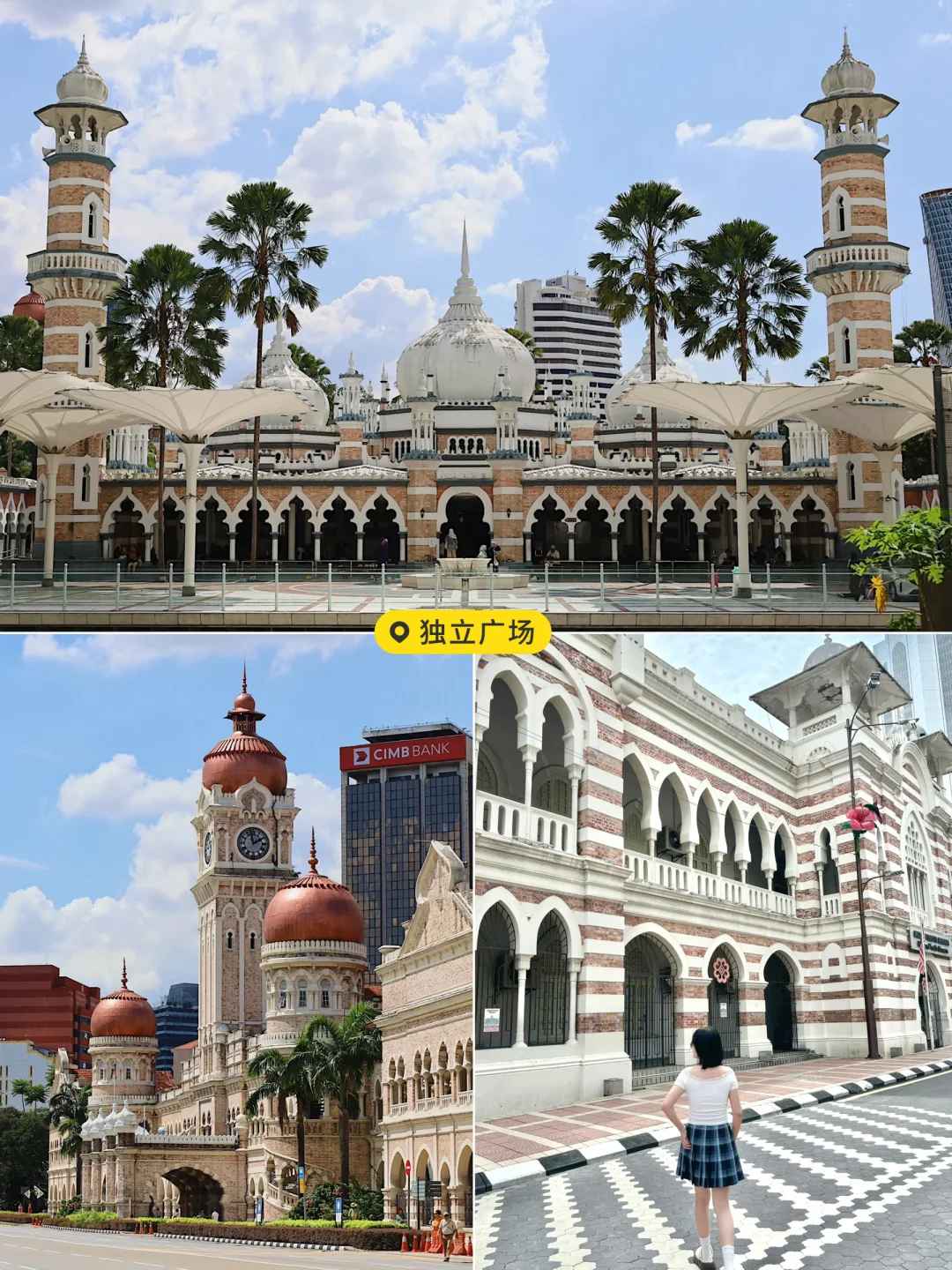 冲双子塔♊️,白天拍 futuristic 摩天楼🎡大片,转场独立广场,红白条纹国旗🇲🇾超上镜,踩在青草地感受南洋微风,国家清真寺🕌️白蓝穹顶美到窒息,穿长裙拍📸光影大片,安静感受信仰的力量!最后去城市画廊,和吉隆坡地标模型同框,解锁趣味打卡姿势