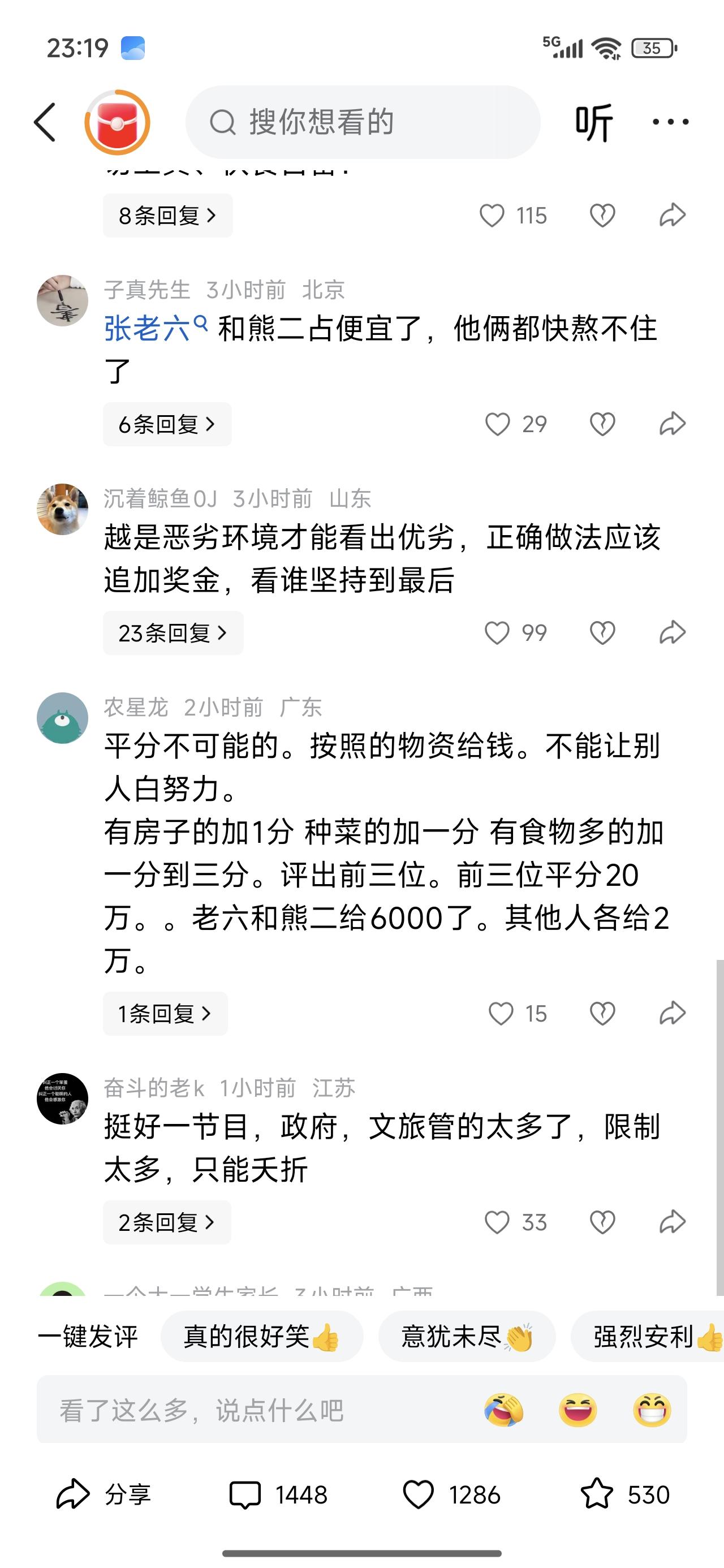 七星山荒野求生半途而废了!20万怎么分!也不可能都是冠军吧!寒潮来了可怕的是熊二还没有火,就怕一早上起来,有选手冻硬了。 平分是不可能的,那该怎么分呢?我心目中的冠军是建哥,其二苗王蜜蜂道友都行。荒野求生比赛 七星山荒野挑战 实在是想不到会这么潦草的结束。
