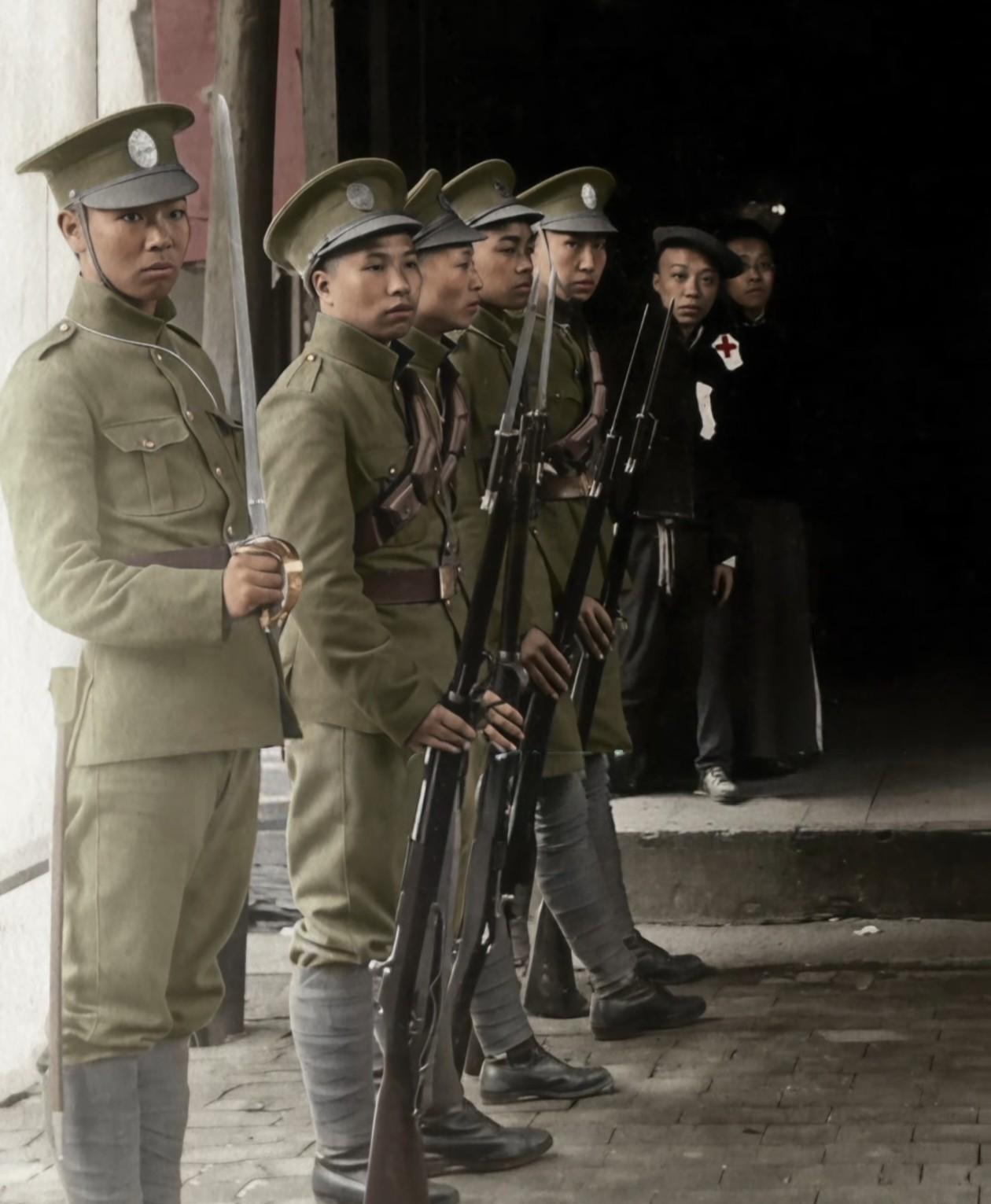 图片是经过修复上色的上海商团武装部队的士兵在刚刚攻打下来的上海江南制造总局门口执勤的照片,时间是1911年11月。 李平书此时正站在总局门楼的台阶上,手指无意识地摩挲着腰间的指挥刀——这位能调动2000多人武装的上海士绅,麾下不仅有400条枪的商团,还有警察部队和救火联合会的武装力量,此刻却在思考三天前那个决定命运的夜晚。 1911年10月10日武昌城头的枪声像一颗火星,迅速点燃了全国的反清烽火,各省纷纷举起义旗,上海这座远东第一商埠也暗流涌动。 革命党人陈其美早就盯上了李平书手中的武装,他多次深夜拜访,在城隍庙的茶馆里反复陈说时局——“清廷气数已尽,先生手握利器,若能举义,上海可定”,终于说动这位原本持观望态度的地方实力派。 11月3日清晨,陈其美带着敢死队员冲向江南制造总局的铁门,他以为凭借革命热情就能拿下这座清军的枪炮工厂,却没料到门后隐藏的多挺重机枪突然咆哮起来,铅弹像雨点般泼洒在冲锋的队伍中。 队伍被打散,陈其美看着身边倒下的同志,一咬牙单骑闯入总局,想凭三寸不烂之舌劝降守军,结果刚跨过门槛就被几支长枪抵住了胸膛——这位意气风发的革命党人成了阶下囚。 消息传到李平书耳中时,他刚率领商团和警察部队控制了上海市区的大部分街道。 “救陈其美,夺制造局!”他在临时指挥部里拍了桌子,连夜调集所有能调动的兵力,将江南制造总局围得水泄不通,连救火联合会的队员都扛着斧头守在了侧门。 11月4日凌晨的薄雾中,起义军的号声刺破了夜空。 总局里的守军本就人心惶惶,听说外面是李平书的队伍,不少人开始偷偷放下枪——毕竟他们中的许多人家就在上海,谁也不想为摇摇欲坠的清廷卖命。 没等起义军发起总攻,守军头目就举着白旗从侧门走了出来,陈其美被簇拥着走出时,身上的长衫还沾着草屑。 有人后来假设,如果那天李平书没有下定决心出兵,仅凭陈其美的敢死队,江南制造总局这颗“钉子”恐怕没那么容易拔掉;甚至,上海的起义会不会像其他一些城市那样,在清军的反扑下夭折? 但历史没有如果。 李平书麾下那2000多人的民间武装——商团的伙计、警察的巡捕、救火会的工匠,这些本该守护地方秩序的力量,此刻却成了推翻旧秩序的急先锋。 这或许正是晚清变局中最微妙的一点:当民间力量不再沉默,他们汇聚的能量足以撬动看似坚固的统治根基。 两天后的11月6日,上海城内锣鼓喧天。 “沪军都督府”的牌子被挂在原道台衙门的大门上,陈其美身着军装站在台阶中央,而李平书则穿着长衫,作为民政总长站在他身侧——一个是振臂一呼的革命领袖,一个是运筹帷幄的地方士绅,此刻却共享着上海光复的荣光。 这场起义不仅拔掉了清政府在江南的重要军事据点,更让全国看到了民间武装与革命力量结合的可能性。 就像照片里那些执勤的士兵,他们或许昨天还是商铺里的学徒、街头的巡捕,今天却成了新时代的守门人——历史的转折,往往就藏在这些普通人的选择与行动里。