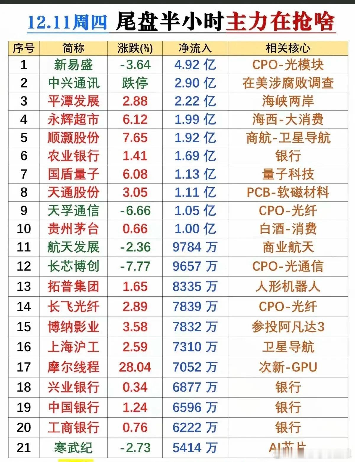 12月11日尾盘半小时资金抢筹个股梳理!1. 新易盛:尾盘净流入4.92亿居首,股价却跌3.64%,核心逻辑是CPO-光模块赛道龙头。资金借股价下跌大幅抄底,看好光模块在算力基建中的需求支撑,尾盘抄底动作凸显对其长期价值的认可,是科技主线的核心抄底标的。2. 中兴通讯:尾盘净流入2.90亿,股价跌停,因涉及在美涉腐败调查事件引发股价异动。主力资金在跌停板上逆势流入,或看好事件落地后的修复预期,也反映出资金对通信龙头的博弈心态。3. 平潭发展:尾盘净流入2.22亿,股价涨2.88%,主打海峡两岸题材。尾盘资金抢筹该标的,依托地域题材的短线热度,虽涨幅有限,但资金布局体现对海峡两岸支线题材的短期关注。4. 永辉超市:尾盘净流入1.99亿,股价涨6.12%,核心是海西-大消费主线。作为零售消费龙头,叠加海西地域属性,尾盘获资金加仓,反映资金对消费复苏及地域题材叠加标的的青睐。5. 顺灏股份:尾盘净流入1.92亿,股价涨7.65%,绑定商航-卫星导航题材。尾盘资金抢筹该标的,借商业航天主线热度布局,卫星导航作为航天细分赛道,获资金短期关注,推动股价上涨。6. 农业银行:尾盘净流入1.69亿,股价涨1.41%,属银行权重标的。尾盘资金布局该银行股,是典型的防御性配置,依托银行板块的低估值与稳定性,成为资金避险的核心选择之一。7. 国盾量子:尾盘净流入1.13亿,股价涨6.08%,主打量子科技题材。量子科技属前沿科技赛道,尾盘获资金加仓,反映资金对高端科技细分领域的挖掘,题材稀缺性推动股价上涨。8. 天通股份:尾盘净流入1.11亿,股价涨3.05%,核心是PCB-软磁材料。作为新材料标的,尾盘获资金布局,软磁材料在电子、半导体领域需求稳定,资金看好其产业价值,推动股价小幅上涨。9. 天孚通信:尾盘净流入1.05亿,股价跌6.66%,聚焦CPO-光纤赛道。资金借股价下跌抄底,CPO-光纤是光通信核心环节,与算力基建高度绑定,尾盘抄底体现对赛道的长期看好。10. 贵州茅台:尾盘净流入1.00亿,股价涨0.66%,属白酒-消费龙头。尾盘资金小幅加仓,依托白酒板块的消费属性与龙头稳定性,是资金防御配置的重要标的,同时也反映消费主线的资金分流。11. 航天发展:尾盘净流入9784万,股价跌2.36%,主打商业航天题材。作为商业航天主线标的,尾盘股价下跌时获资金抄底,体现资金对商业航天赛道的持续关注,看好其产业发展前景。12. 长芯博创:尾盘净流入9657万,股价跌7.77%,聚焦CPO-光通信赛道。资金借股价大跌抄底,光通信是算力基建的核心环节,尾盘抄底动作反映对该细分赛道的布局意愿,虽短期股价弱势但获资金认可。13. 拓普集团:尾盘净流入8335万,股价涨1.65%,主打人形机器人题材。人形机器人属新兴赛道,尾盘获资金布局,反映资金对高端制造细分题材的挖掘,虽涨幅有限但题材获短期关注。14. 长飞光纤:尾盘净流入7839万,股价涨2.89%,核心是CPO-光纤赛道。作为光纤领域龙头,尾盘获资金加仓,依托CPO主线热度,资金布局体现对光通信产业链的全面看好。15. 博纳影业:尾盘净流入7832万,股价涨3.58%,因参投《阿凡达3》获关注。影视传媒题材因热门影片上映获短期催化,尾盘资金抢筹该标的,借事件驱动进行短线布局。16. 上海沪工:尾盘净流入7310万,股价涨2.59%,主打卫星导航题材。卫星导航是商业航天的重要分支,尾盘获资金布局,依托航天主线的整体热度,成为细分赛道的资金布局标的。17. 摩尔线程:尾盘净流入7052万,股价涨28.04%,核心是次新-GPU题材。次新股叠加GPU稀缺题材,尾盘获资金爆炒,股价大幅上涨,成为短线资金追捧的热点标的,题材稀缺性是核心驱动。18. 兴业银行:尾盘净流入6877万,股价涨0.34%,属银行权重标的。尾盘资金布局该银行股,是防御性配置思路的体现,依托银行板块的低波动特征,成为资金避险的选择。19. 中国银行:尾盘净流入6596万,股价涨1.24%,属银行权重标的。尾盘获资金加仓,与农业银行、兴业银行形成联动,是资金扎堆布局银行板块、进行防御配置的典型体现。总结本次尾盘资金布局清晰呈现“攻科技、守银行消费”的思路:CPO-光模块、商业航天等科技主线是进攻核心,即便部分科技股下跌仍获抄底,反映资金对科技赛道的长期信心;银行权重与消费龙头则成为防御配置的主要方向,承接避险资金;次新+GPU等稀缺题材偶发炒作,而事件驱动型标的则出现资金博弈,整体尾盘资金布局兼顾了赛道成长与板块防御。本文涉及资讯、数据等内容来自网络公共信息,仅供参考,不构成投资建议!