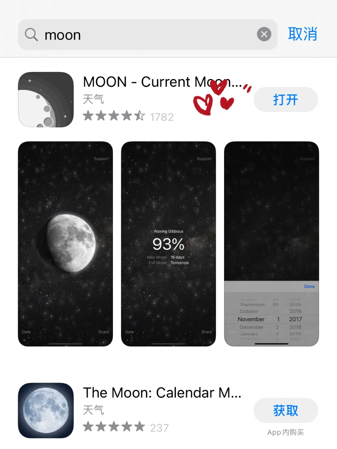 1⃣️下载软件:app store搜Moon,软件首页下面可以选择日期生成自己的月相图片,点share分享到微信然后保存下来;
