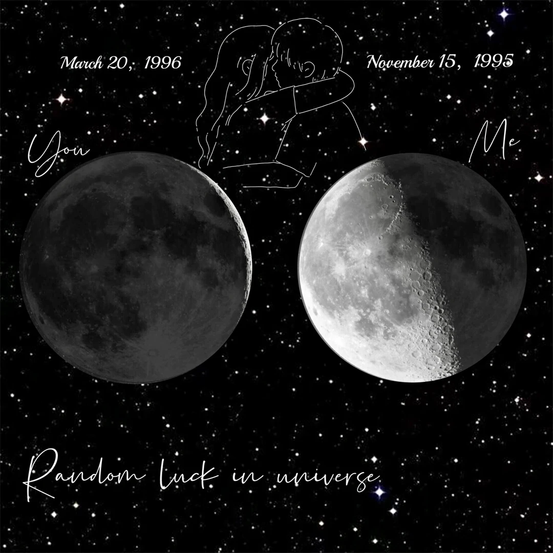前几天偶然发现的moon相框🖼️,感觉很漂亮很有意义,忍不住动手制作了🥳,相框图片是用两个人出生那天的月相组合而成的🌙,代表的意义是“宇宙中恰好相遇的浪漫”💕