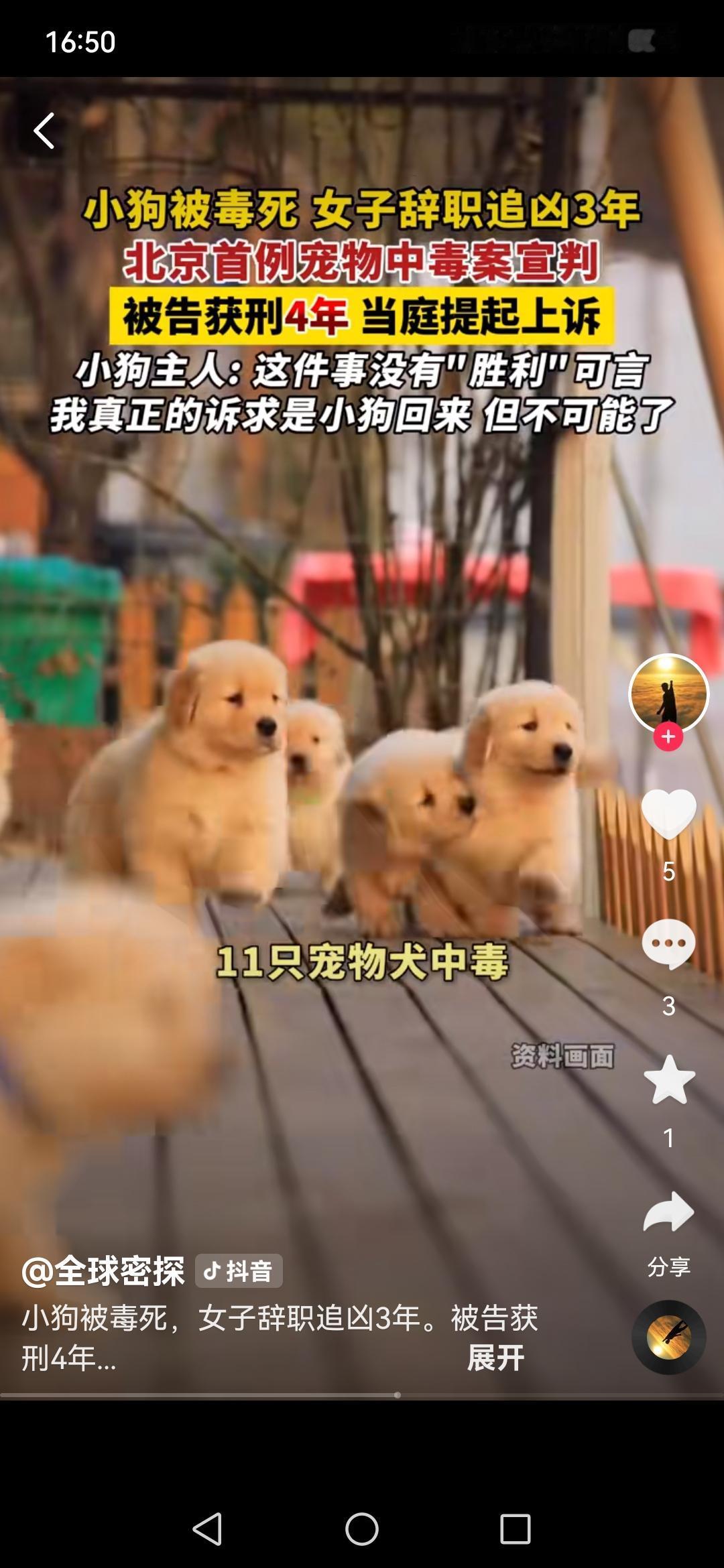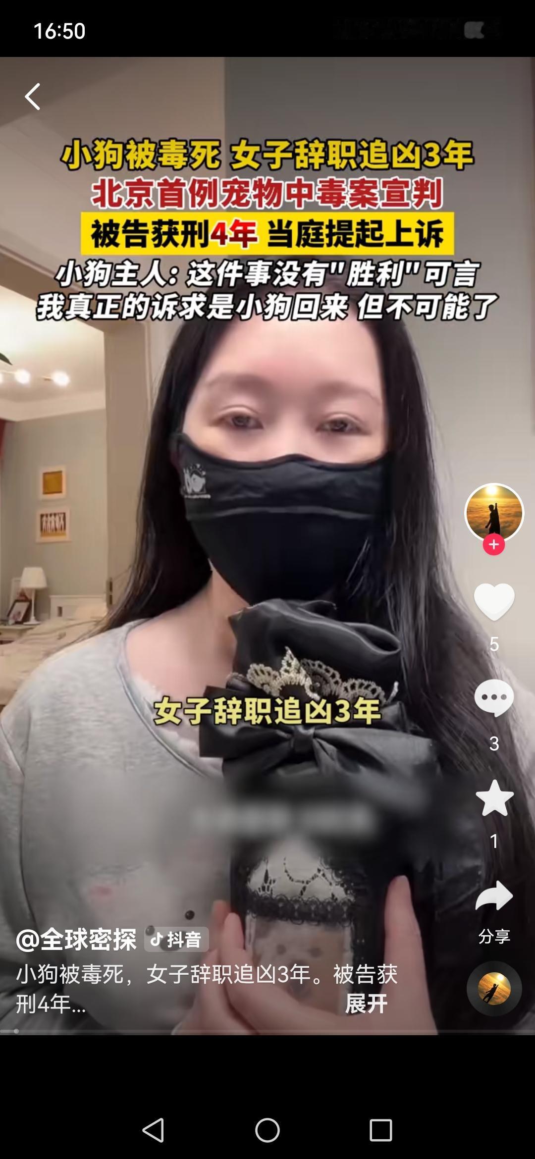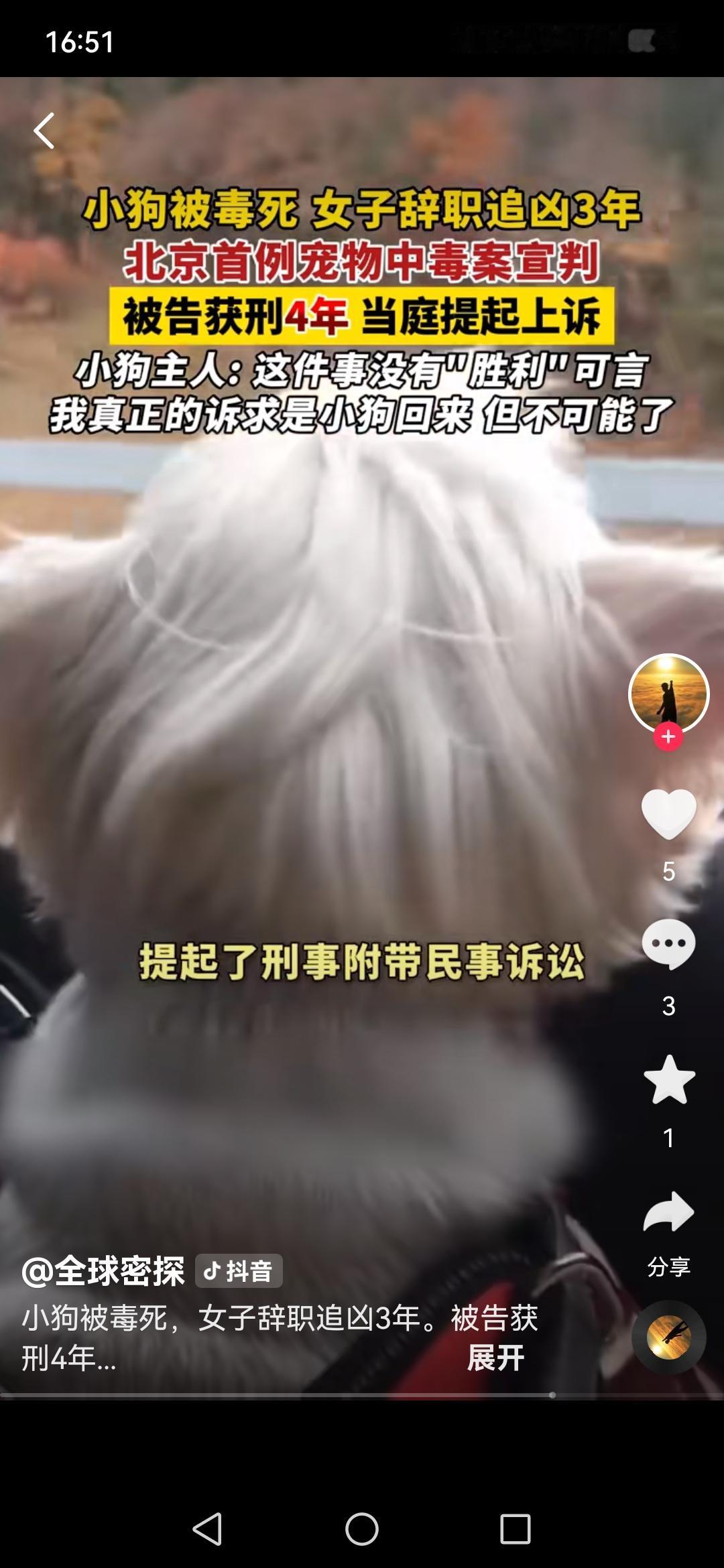 养13年爱犬被毒杀,主人辞职追凶1000天,凶手获刑4年仍上诉:这不是宠物纠纷,是公共安全事件! 13年,足以让一只小狗从毛茸茸的幼崽变成陪伴主人半生的家人。可李女士没想到,相伴13年的西高地白梗Papi,会以浑身抽搐、口吐鲜血的方式告别这个世界——2022年9月的一天,小区邻居张某某用国家明令禁止的剧毒氟乙酸钠,浸泡鸡脖子、碎肉投放在公共区域,不仅夺走了Papi的生命,还导致小区11只宠物犬中毒、9只死亡,2只流浪猫也未能幸免 。 这不是简单的邻里矛盾,而是赤裸裸的公共安全危机。氟乙酸钠对人的致死剂量仅0.5-2.0mg/kg,闻嗅或接触皮肤都可能致命,而投毒地点就在小区草坪、单元楼门口,甚至靠近儿童游乐区 。案发后,居民不敢让孩子在楼下逗留,家长们提心吊胆,谁也不知道孩子会不会误食毒饵,谁也不确定自己会不会意外接触毒物。可投毒者张某某被捕时还嘴硬“一人做事一人当”,庭审中却前后矛盾,一会儿说喜欢狗,一会儿说讨厌狗,还坚称宠物死亡与自己投毒无关 。 为了给Papi和其他受害宠物讨公道,李女士辞掉了工作,患上了抑郁症,每天靠精神类药物支撑,脖子上挂着Papi的骨灰项链,自学刑法踏上了长达1000多天的追凶路 。这期间,案件经历9次延审,从2023年开庭到2025年12月宣判,她一次次在希望与煎熬中等待,却从未放弃——因为她深知,这起案件是北京首例宠物中毒刑事公诉案,将成为无数类似事件的标杆 。 当一审法院以投放危险物质罪判处张某某有期徒刑4年时,李女士却没有想象中的轻松。更让人愤怒的是,张某某当庭提出上诉,似乎还不认可自己的罪行 。有网友觉得“毒死几只狗判4年太重”,可他们忘了,张某某投放的是剧毒物质,危害的是不特定多数人的安全,哪怕没造成人员伤亡,也已触犯刑法底线,4年刑期恰是对其行为社会危害性的合理回应 。 李女士说:“无论判决是什么结果,我都是输家。”是啊,13年的陪伴再也找不回,那些深夜的思念、抑郁症的折磨,都成了她余生无法愈合的伤 。但她的坚持没有白费,这起案件撕开了邻里矛盾的极端缩影:不文明养犬该被规范,但以投毒泄愤绝不可取;宠物是家人,可公共安全更是底线。 如今,李女士还要继续上诉,争取合理的民事赔偿,甚至计划起诉未及时提醒业主的物业 。有人问她值得吗?她的回答戳中了无数人:“我不是死磕,是做事认真。” 你怎么看这起案件?4年刑期是否合理?面对邻里矛盾,到底该如何理性解决?热点话题 宠物犬中毒