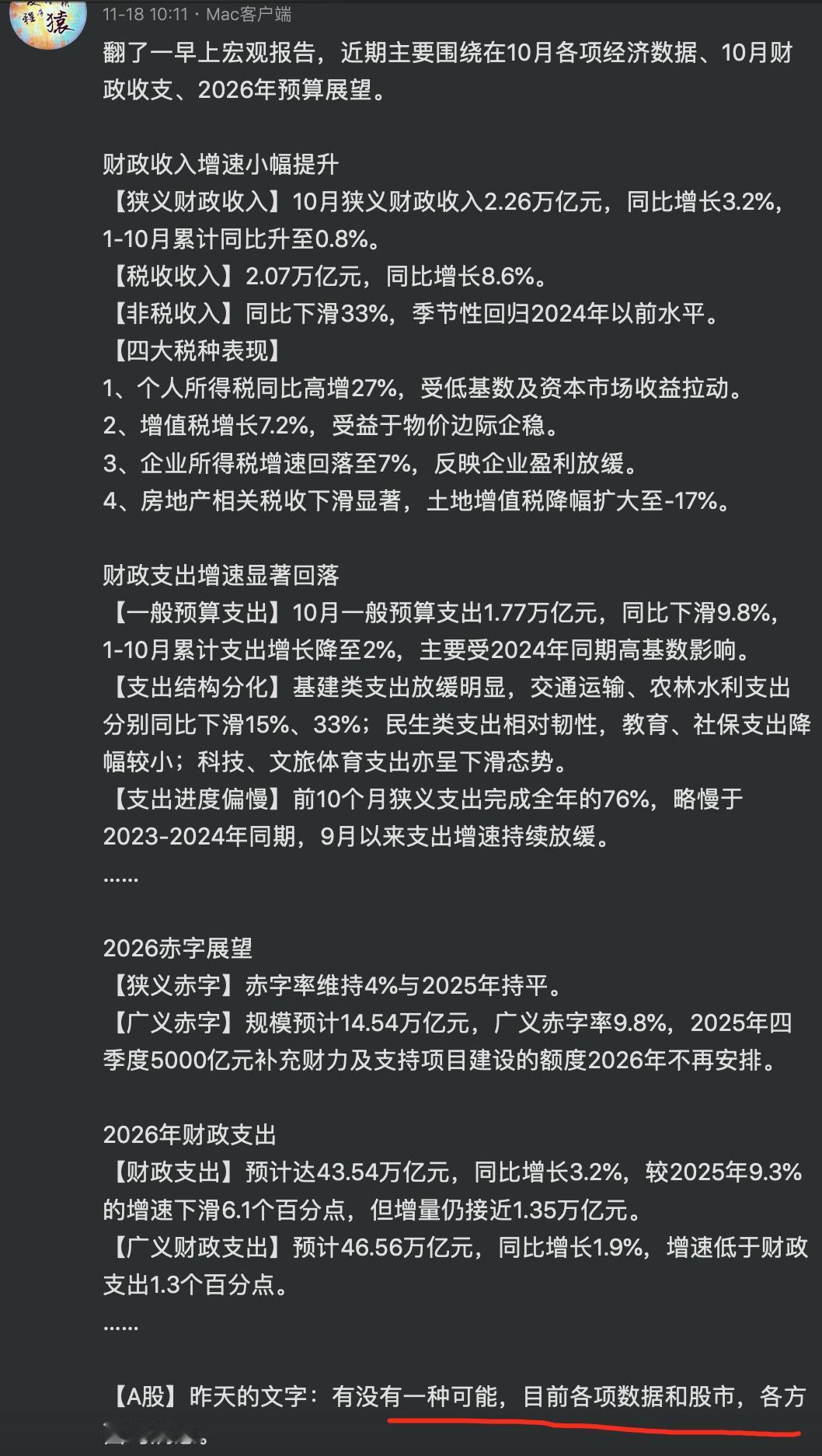【经济工作会议,没有想象空间】 近几年,今年经济工作会议的市场期望最低。 简单而言,就这么回事。 【总量】较2024年“提高财政赤字率”更为克制,强调“保持必要的财政赤字、债务总规模和支出总量”,预计2026年广义财政赤字率维持4%。 【政策工具】从2024年“适时降准降息”调整为“灵活高效运用降准降息等多种政策工具”,预计至少实施一次降准降息。 【房地产】供强需弱,政策重心从需求端放松转向“控增量、去库存、优供给”,重点为防风险而非刺激增长。 【国企改革】 明年主要任务,提到,制定和实施进一步深化国资国企改革方案。 2025年前三季度央企完成固定资产投资超过3万亿元,其中约40%投向新兴产业,通过“大工程大项目”为各类市场主体在技术和产业融合方面提供合作空间。 …… 宏观在左,交易在右,资本永不眠!