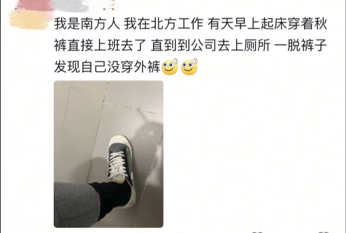 我是南方人, 我在北方工作 ,有天早上起床穿着秋裤直接上班去了, 直到到公司去上厕所, 一脱裤子发现自己没穿外裤