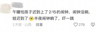 午睡怕孩子迟到,上了 2:15的闹钟,闹钟没响,娃迟到了,半夜闹钟响了,吓一跳