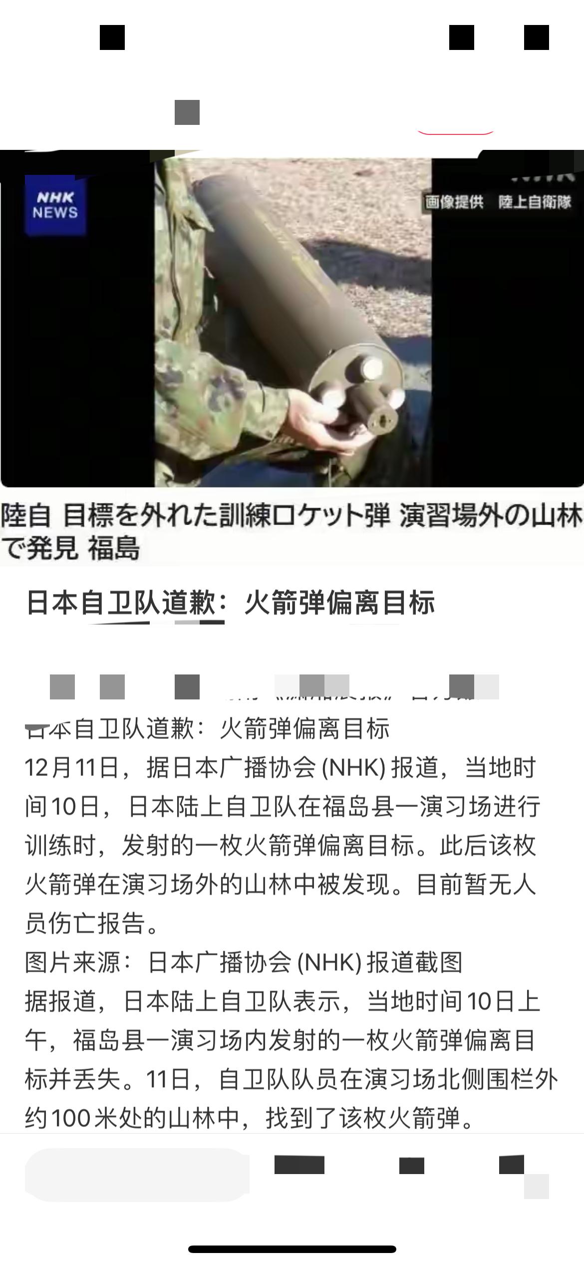 日本自卫队这波操作太离谱! 火箭弹训练直接飞丢,最高长官鞠躬道歉,可这歉意根本经不起细品! 23公斤的火箭弹在福岛演习场脱靶,消失一天一夜才在百米外山林找到,还好是训练弹没爆炸。 但想想就后怕,福岛本就是敏感之地,居民早被过往的阴影笼罩,自卫队的训练反倒成了新惊吓。 更讽刺的是,日本近年军费飙到GDP的2%,忙着搞军备扩张,却连最基础的发射精准度都没搞定。 野心配不上实力,就是现在的真实写照——光顾着买先进装备、喊强硬口号,却忽略了最基本的训练安全和专业素养。 这哪是简单的“脱靶”,分明是暴露了军备扩张背后的安全漏洞。 道歉没用,真要让人放心,得先把基本功练扎实吧? 你觉得这种低级失误该怎么杜绝?来评论区聊聊~