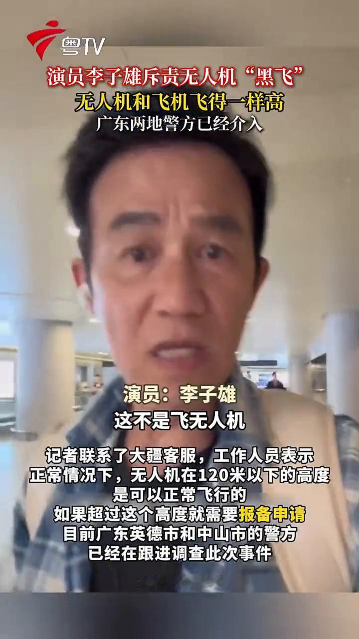 演员李子雄斥责无人机"黑飞",无人机和飞机飞得一样高,广东两地警方已经介入。 羊城晚报。 近日,演员李子雄发布视频斥责有人不顾他人安危进行高空"黑飞",挑战航空安全底线,随后李子雄在线@广东公安、湖南公安、中山网警、平安英德等社交账号。 无人机跟飞机飞得一样高,毛孔都炸开了。记者联系了大疆客服,工作人员表示正常情况下,无人机在120米以下的高度是可以正常飞行的,如果超过这个高度就需要报备申请。目前广东英德市和中山市的警方已经在跟进调查此次事件。