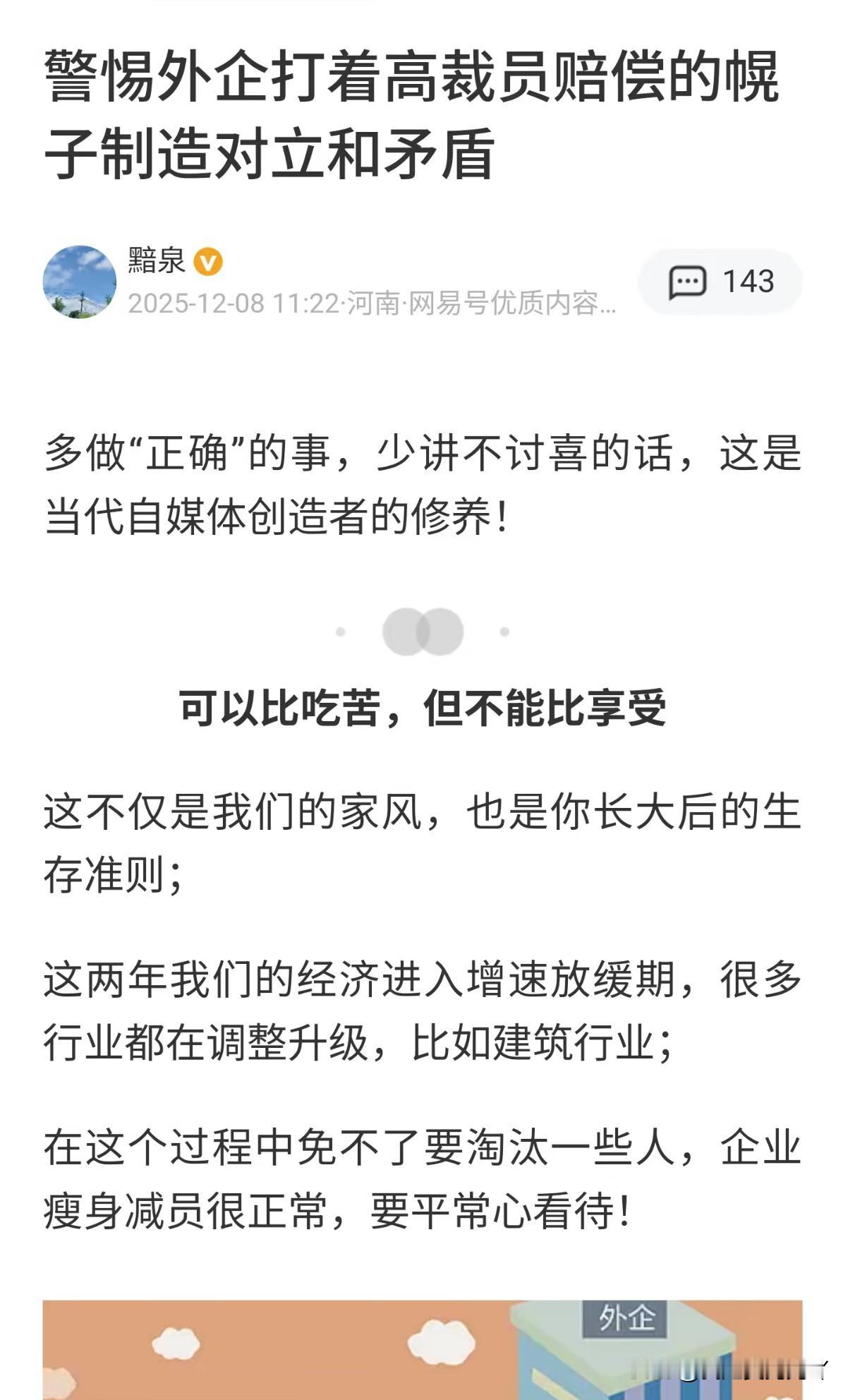 非得吃苦吗?可是吃的苦中苦就会有吃不完的苦啊 外企裁员赔偿高就赔偿高嘛那是外企的事,花的都是外企的钱国内企业又没损失,而且现在外企也走的差不多了以后也拿不到高遣散费了,别人花钱你怎么还急眼了 外企多给员工钱就是制造对立跟矛盾这话好没道理,告诉你最简单的一招我们也给,给更多就能破解他们的阴谋