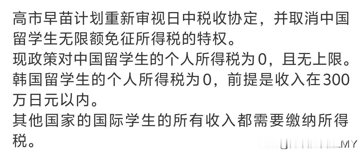 高市早苗出手狠辣,中方留学生42年日本免税特权被取消! 高市早苗的一番操作堪称步步紧逼,直接将实行了42年的中方留学生日本免税特权彻底废除,这般针对性极强的举措,着实令人愤慨不已。 毫无征兆的政策变动,让超12万在日中方留学生瞬间陷入被动,往后打工所得再也无法享受免税待遇,必须和其他国家留学生一样依法缴纳所得税。 过往无上限的免税福利彻底成为历史,对比之下,韩国留学生仍能享受300万日元内免税的待遇,这般差别对待,难免让人感受到刻意针对的恶意。 要知道,这份免税特权陪伴中方留学生走过四十余年,早已成为不少在日中方留学生维持生计的重要支撑。留学生海外求学本就不易,学费生活费压力重重。 大多会靠打工补贴开支,无上限的免税政策能帮他们减轻不少经济负担,让他们能更安心地投入学习生活。可高市早苗一声令下便将其砍掉,全然不顾留学生的实际困境。 无疑是给本就不易的求学之路再添枷锁,每月收入大幅缩水,生活压力陡增,不少留学生怕是要为生计疲于奔命,求学节奏都可能被打乱。 不仅如此,高市早苗的针对目光远不止于此。更过分的是,她还提出限制有拖欠医疗费记录的外国人入境,这般条款看似合理,实则让在日国人的生活与发展处处受限。 一系列密集操作下来,明眼人都能看出猫腻,这哪里是什么正常的政策调整,分明是在刻意针对在日国人,变相助长日本国内的排外情绪。 日本向来标榜开放包容,如今却在政策上处处针对国人群体,从留学生免税特权的取消,到跨境电商的严查征税,再到入境限制的收紧,每一步都在抬高华人在日生活的门槛。 同为留学生,中方留学生此前的无上限免税与韩国留学生的300万日元免税本就存在差异,如今直接取消中方留学生的免税资格,这般区别对待,毫无公平可言,背后的针对性不言而喻。 高市早苗的这些举措,看似是为了规范日本的税收与入境秩序,实则短视又自私,不仅伤害了在日华人的感情,还会影响日本的国际形象。 中方留学生为日本的教育产业注入活力,带来了可观的经济收益,跨境电商也为日本市场增添了活力,华人在日的各类活动都在推动当地经济发展,如今却遭这般针对性对待,难免让人心寒。 对于在日华人而言,这些政策变动带来的冲击实实在在,生活成本攀升,发展阻力加大,每一步都走得愈发艰难。 高市早苗的针对性操作,终究掩盖不了排外的本质,这般举措不仅无法解决日本自身的问题,反而会激化矛盾,引发更多不满。