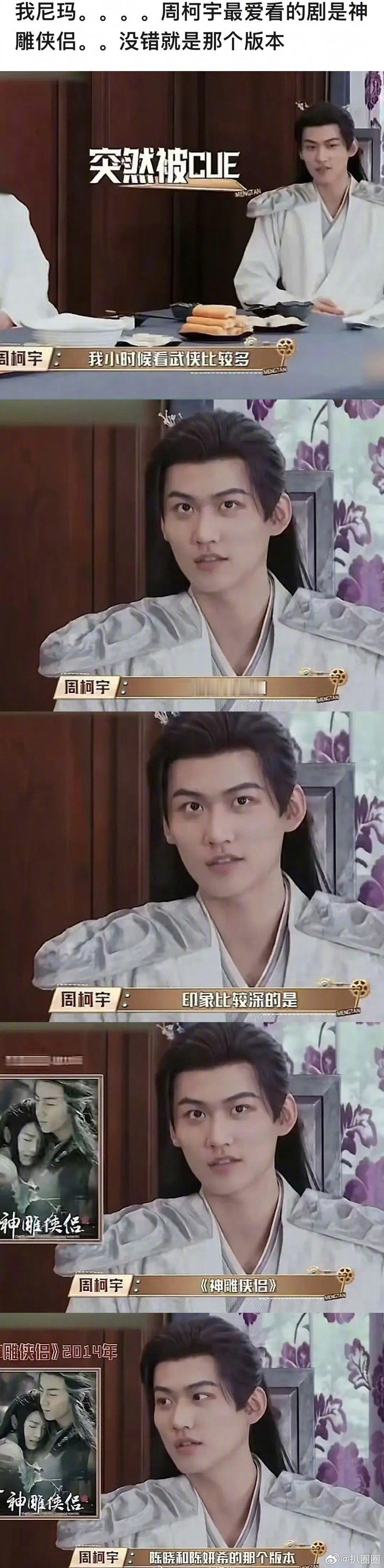 周柯宇:爱看武侠电视剧,印象最深的就是陈晓、陈妍希那版的《神雕侠侣》,俺不中了~